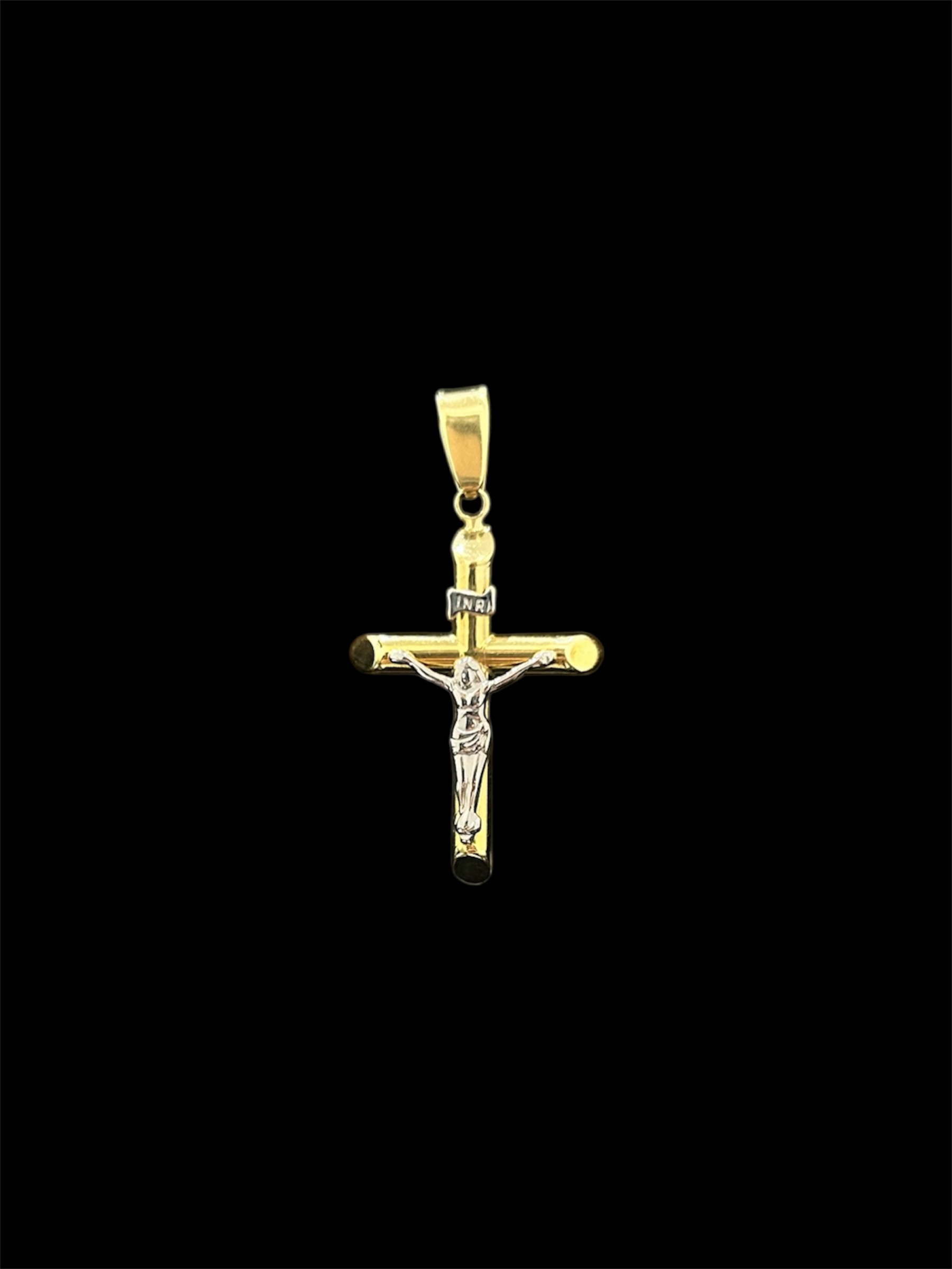 pendentif en forme de croix avec le Christ, or jaune et or blanc,longueur 30 mm sur 20 mm de largeur,belière pour chaine max 4 mm