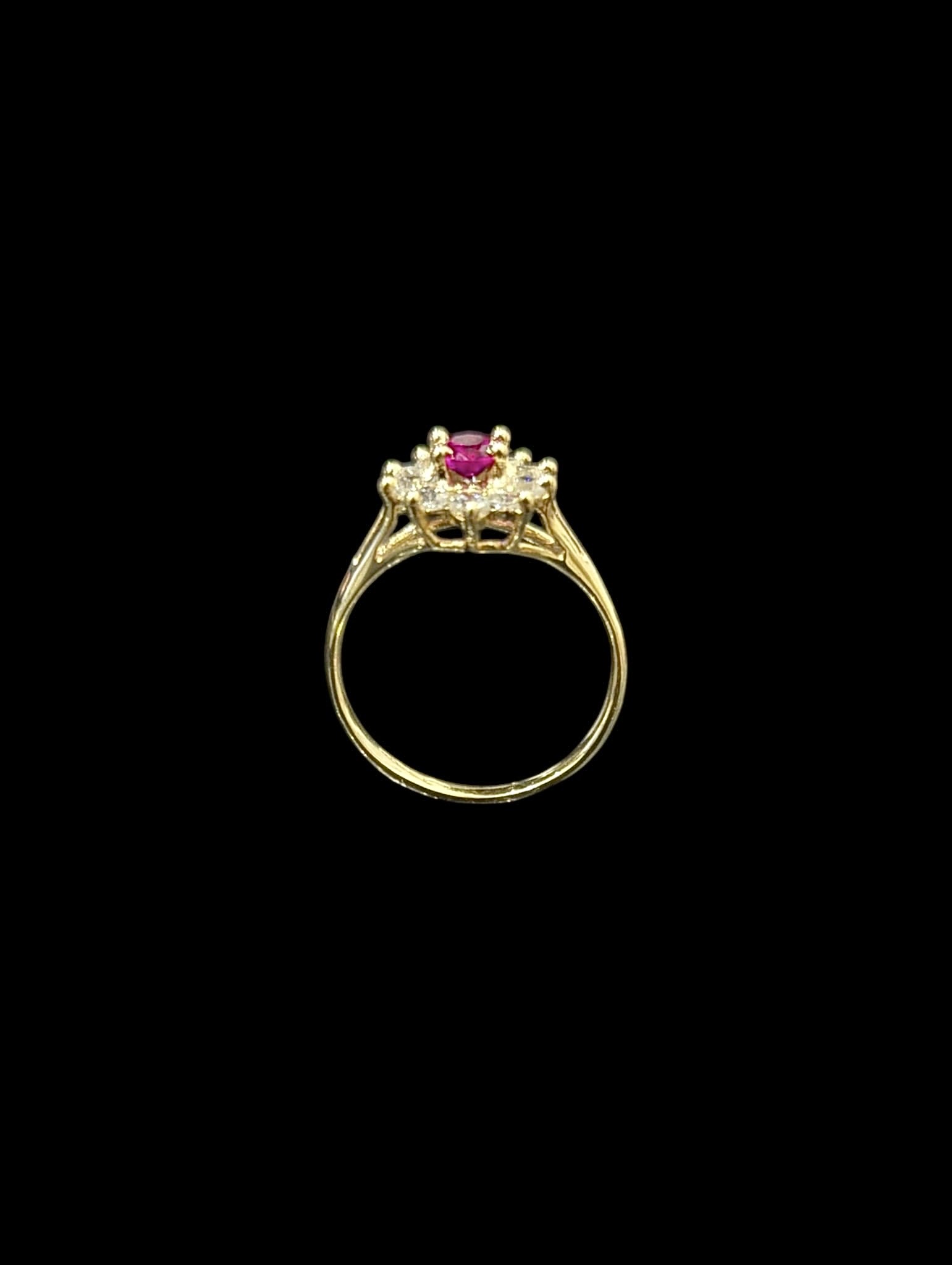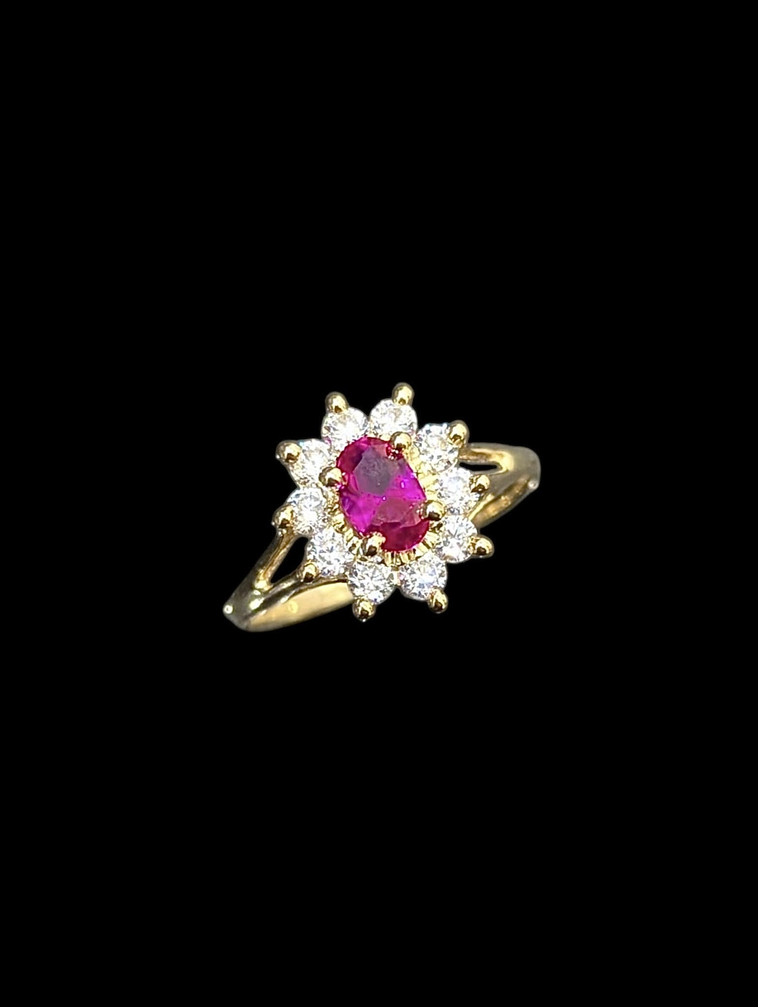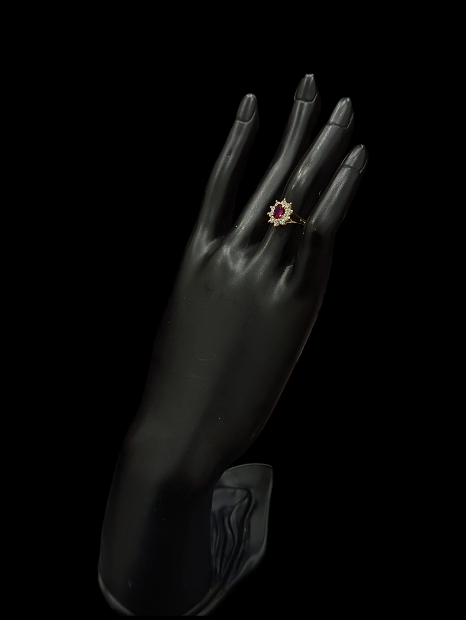 Bague en forme de fleur empierrée de pierres synthétiques de couleurs rose fushia et en oxyde de zirconium blanche, de longueur 12 mm sur 11 mm de largeur.