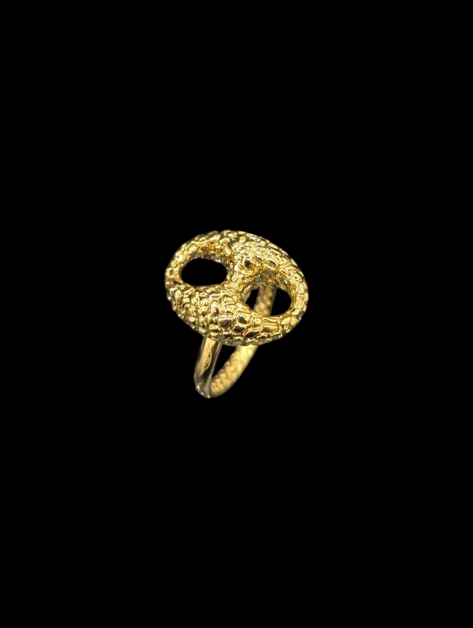 Bague en or 18 carats ornée d’un motif grain de café à finition nugget, mesurant 15 mm sur 20 mm, avec un anneau de 2 mm de largeur. Un bijou au design iconique, à la fois élégant et affirmé.