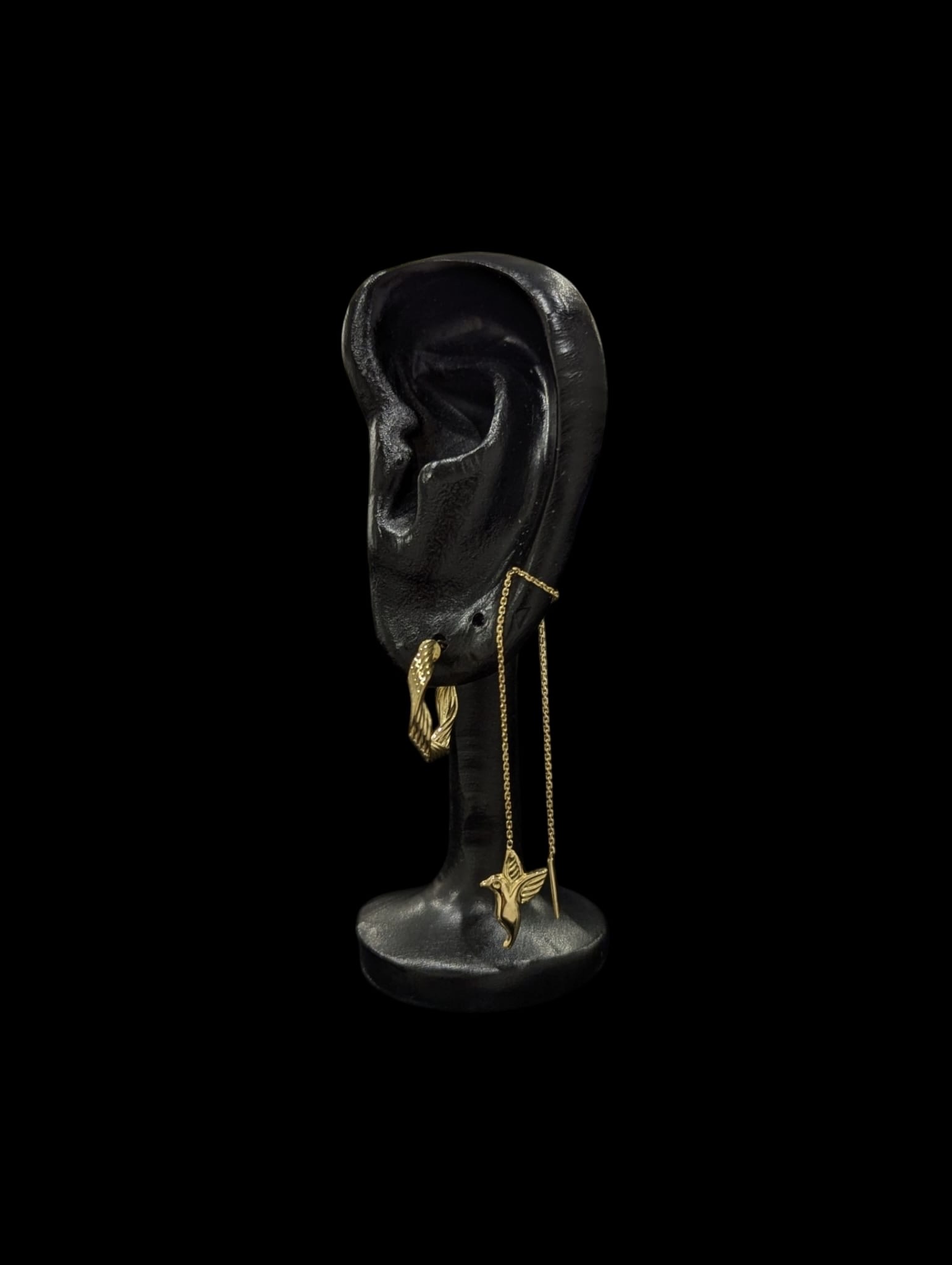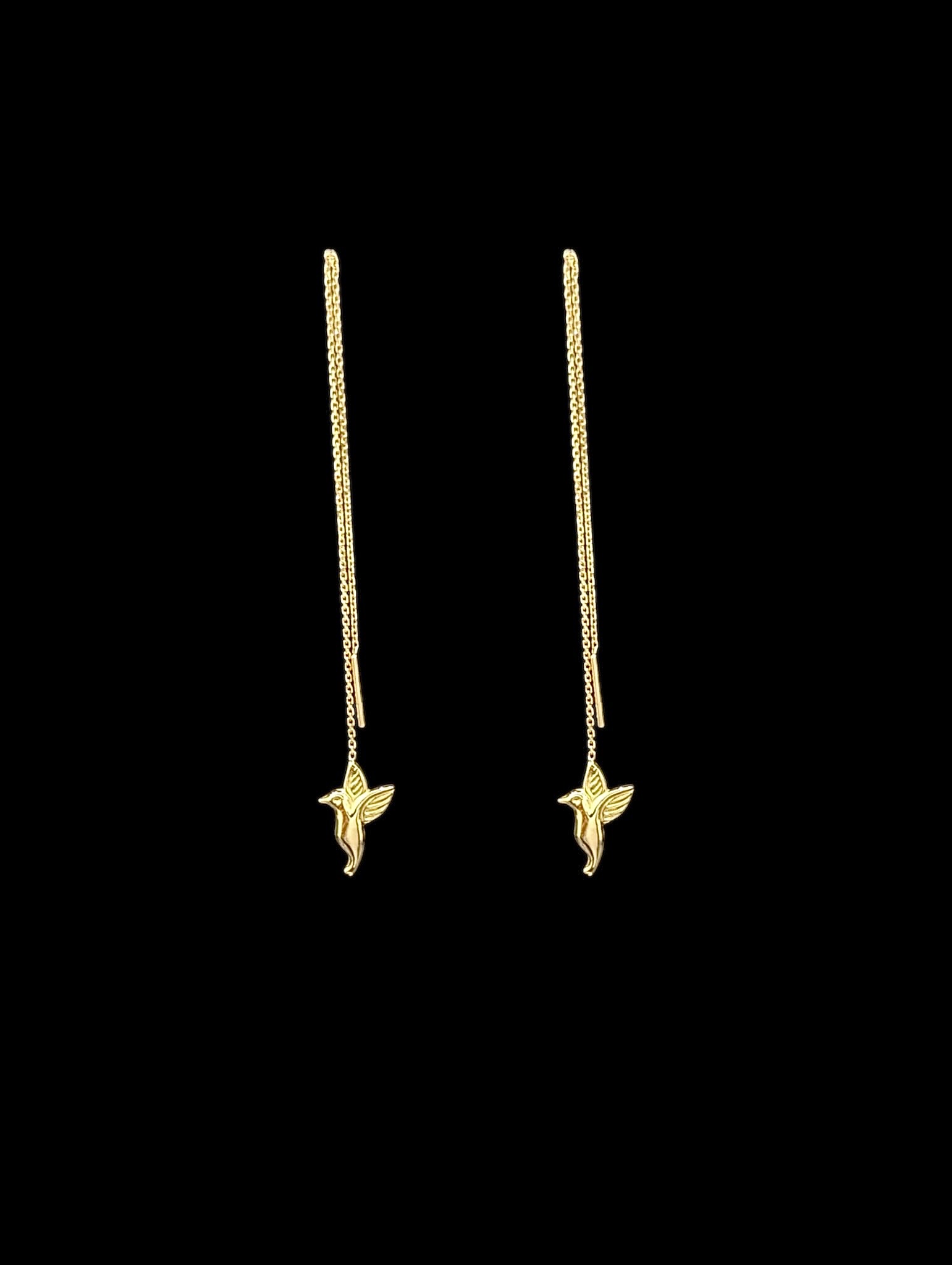Boucles d’oreilles chaînette accompagnées de son motif colibri de longueur 14 mm sur 9 mm de largeur. Boucles d’oreilles de longueur totale 12 cm.