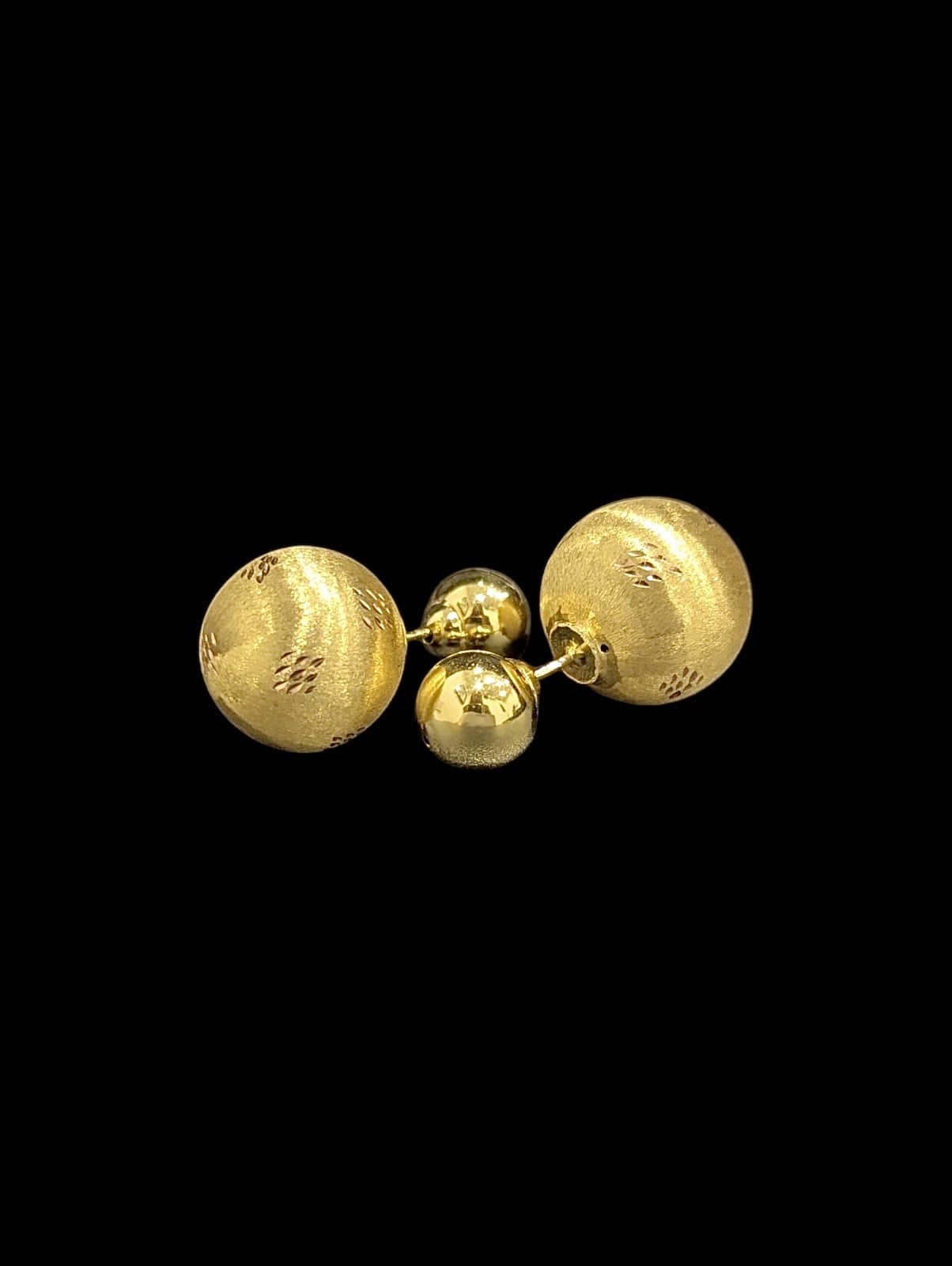 Boucles d’oreilles double boule lisse (diamètre 10 mm) et satinée (diamètre 19 mm). Fermoir boule.