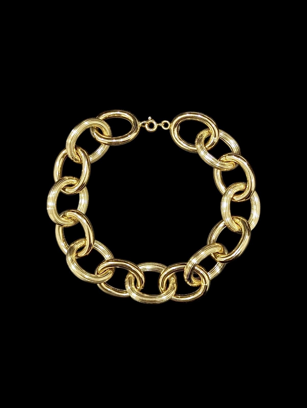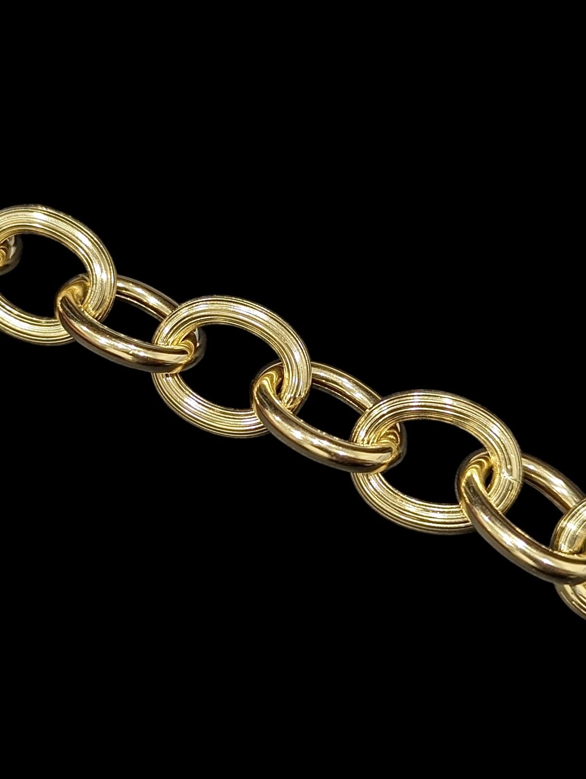Bracelet maille forçat lisse canellé, de longueur 22 cm sur 16 mm de largeur. Fermoir anneau ressort.