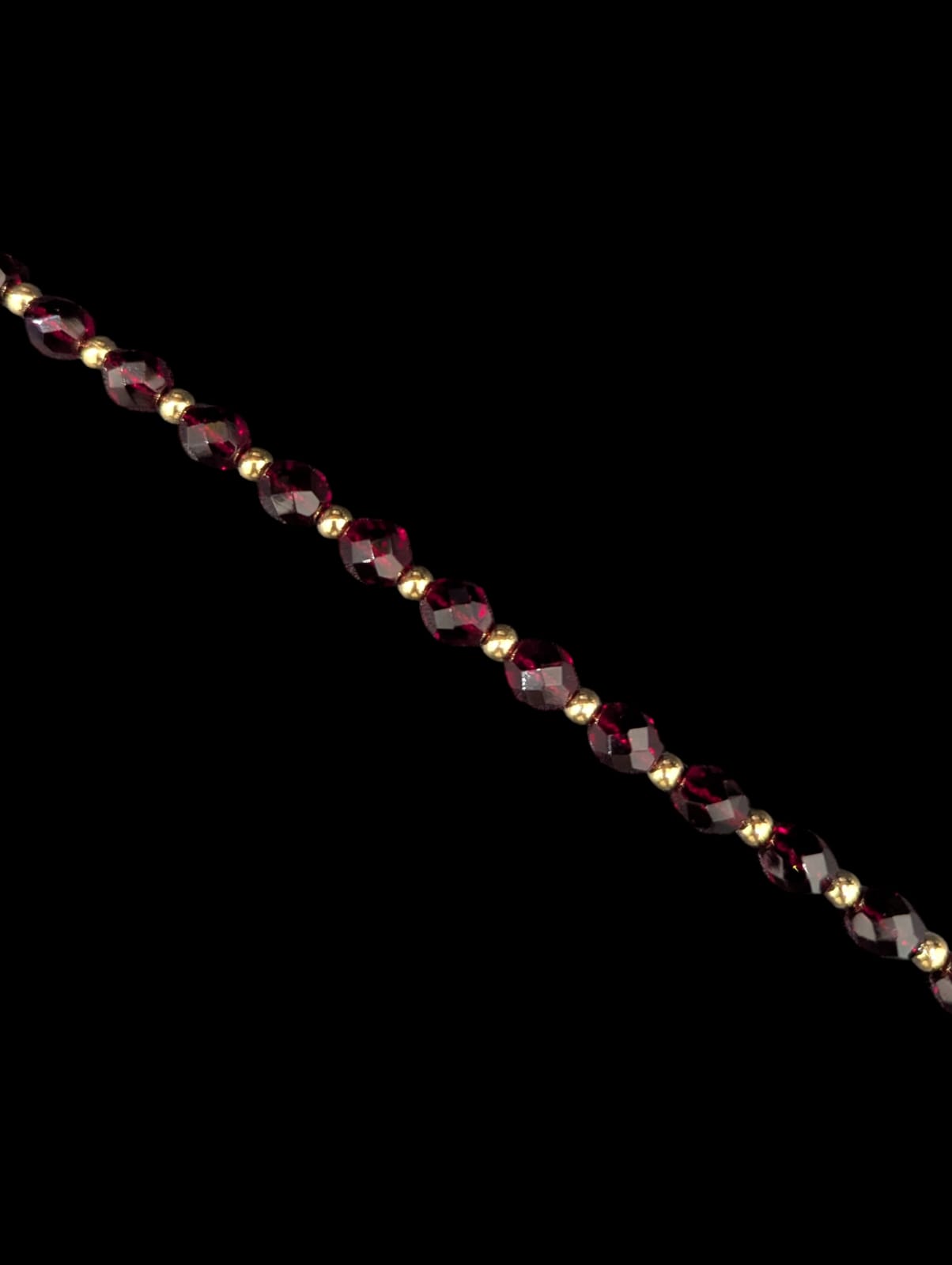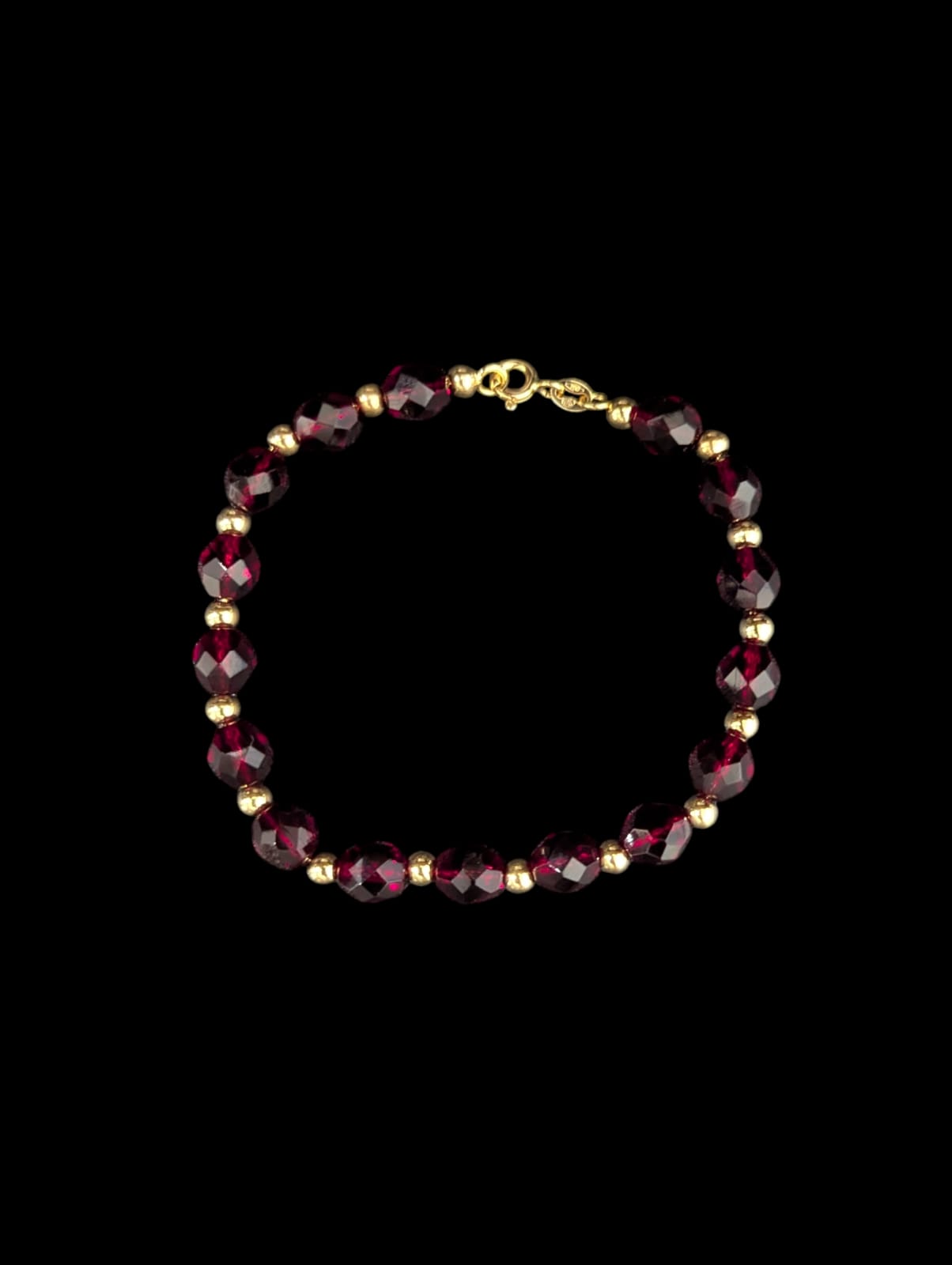 Bracelet avec des grains d’or(boule de 3mm) alternée avec des grenats(7mm),longueur 20 cm,fermoir anneau ressort