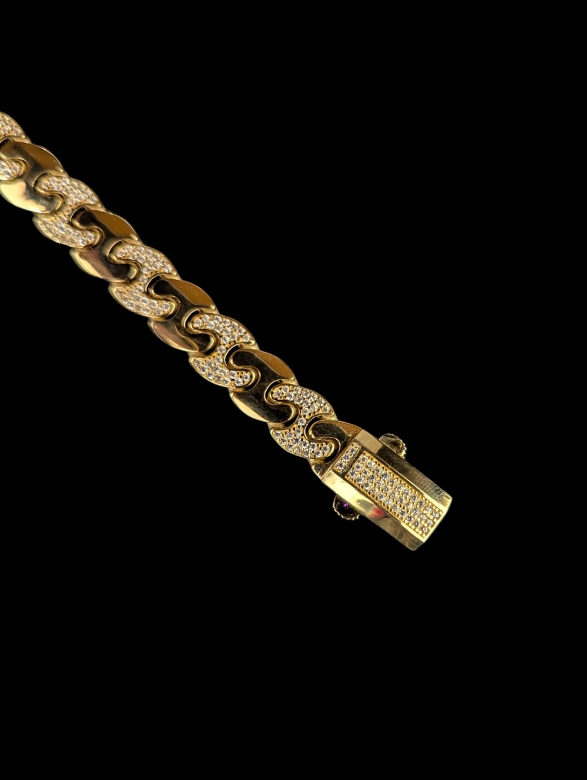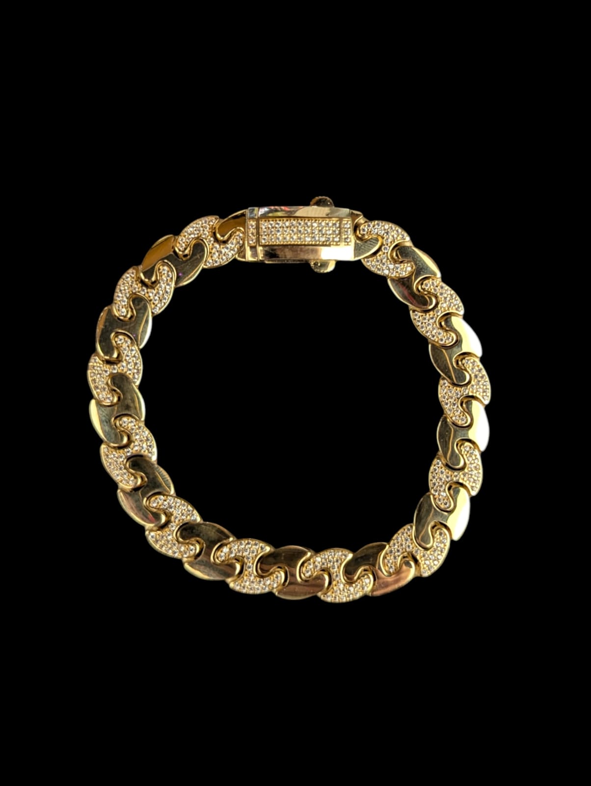 Bracelet Plat de maille haricot,alternée lisse et sertis d’oxyde de zirconium,largeur de bracelet 10 mm sur 19,5 cm de longueur,fermoir à clips