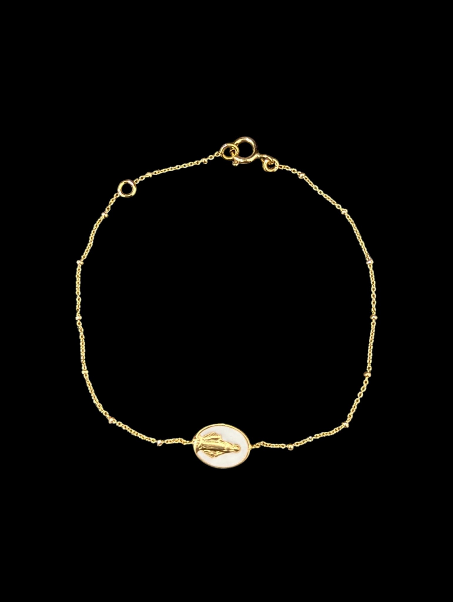 Bracelet en or 18 carats à maille forçat de 18 cm, doté d’un fermoir anneau ressort, orné d’une médaille Miraculeuse avec une pierre blanche de 13 mm de diamètre. Un bijou symbolique et délicat, idéal à porter au quotidien.