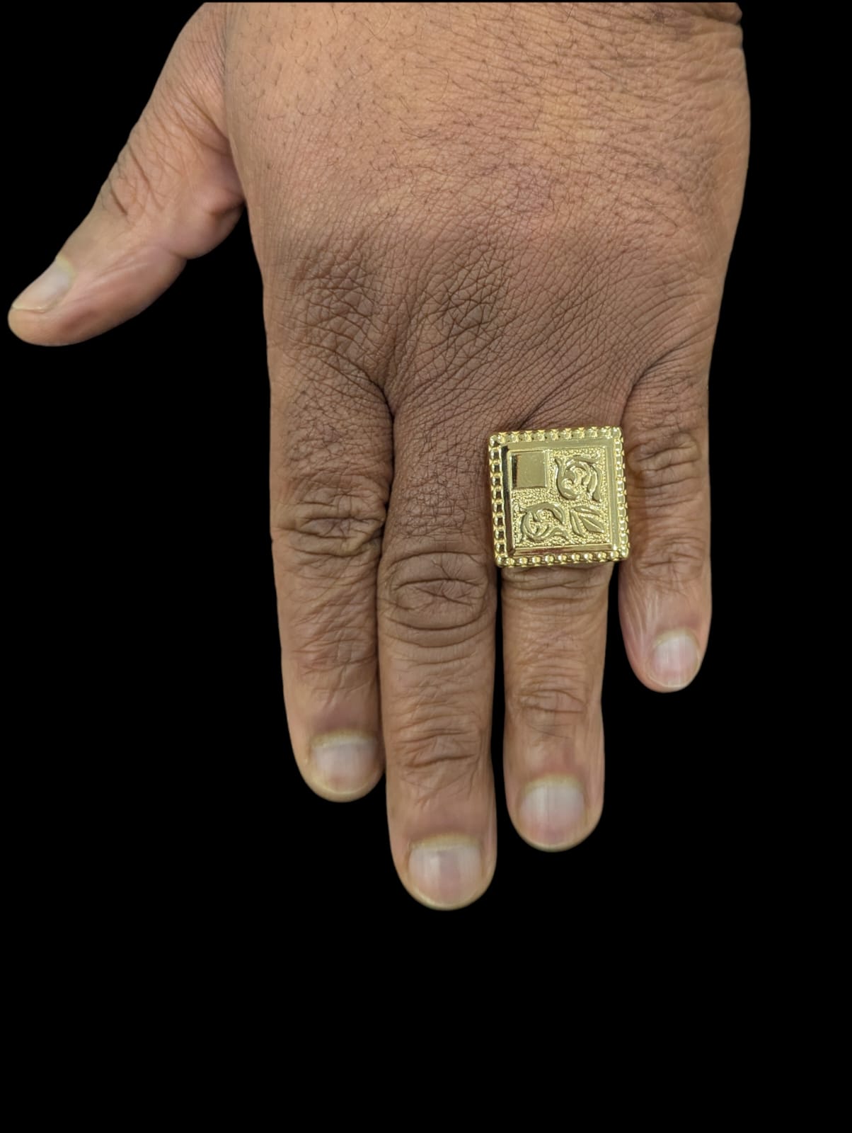 Chevalière carrée « biscuit » ciselée sur les bordures, détails lys. Chevalière de largeur 24 mm sur 24 mm de longueur, hauteur de plateau 8 mm.