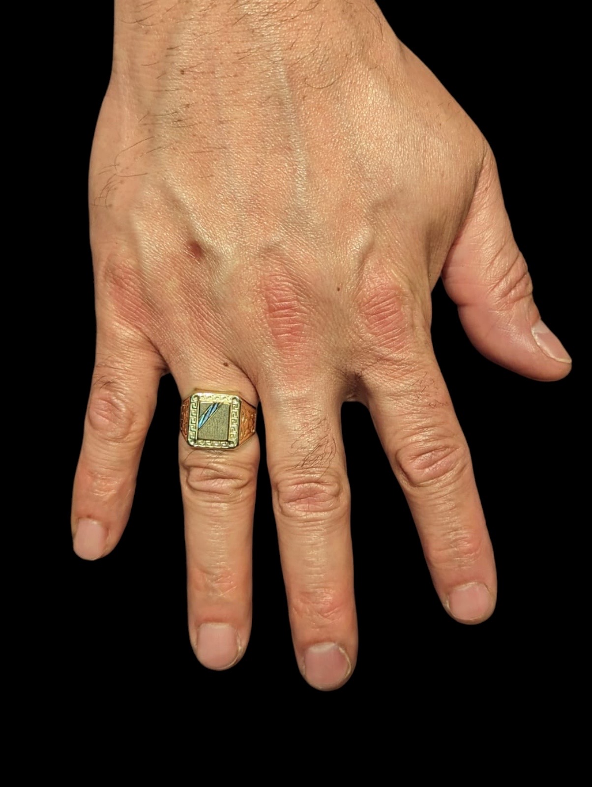chevalière carrée avec motif ciselé,contour style grec,largeur 16 mm sur 18 mm de longueur