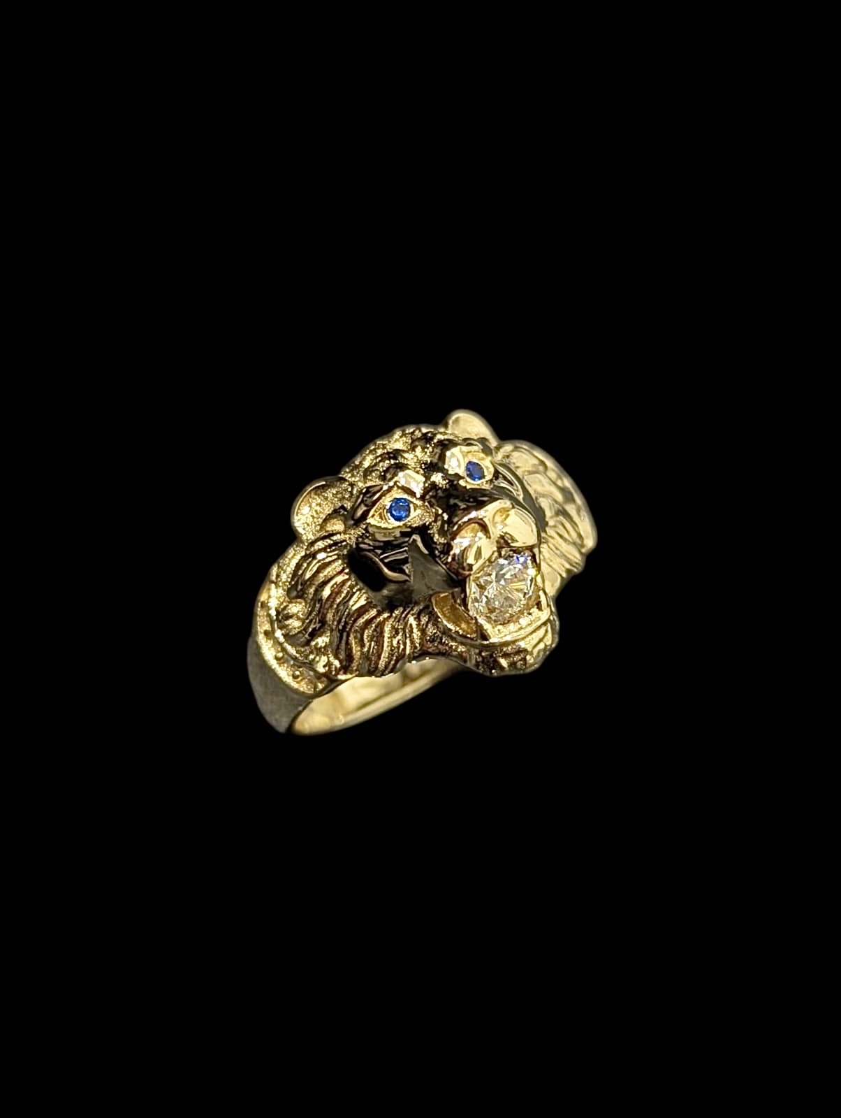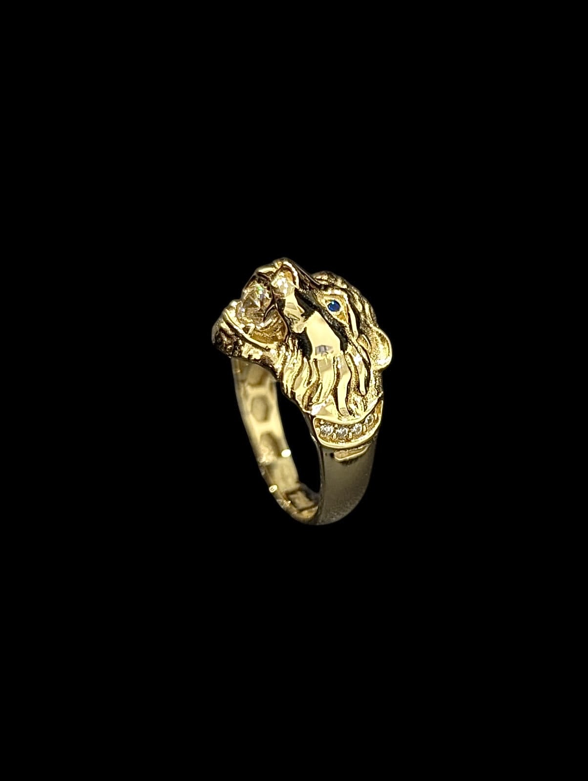 Chevalière 3D en forme de tête de lion, empierrée d’oxyde de zirconium et les yeux de pierres de couleur bleue. Chevalière de longueur 15 mm.