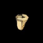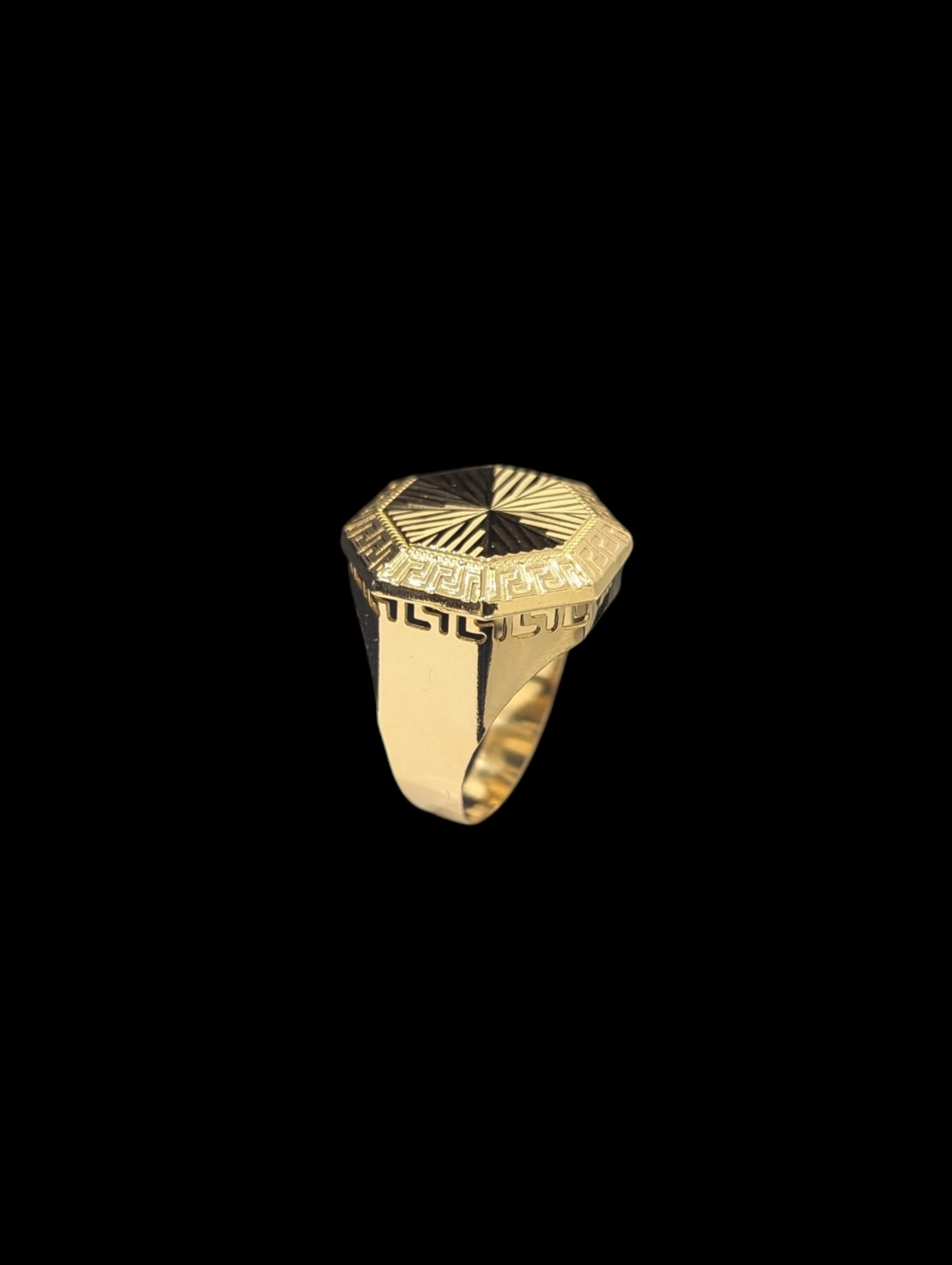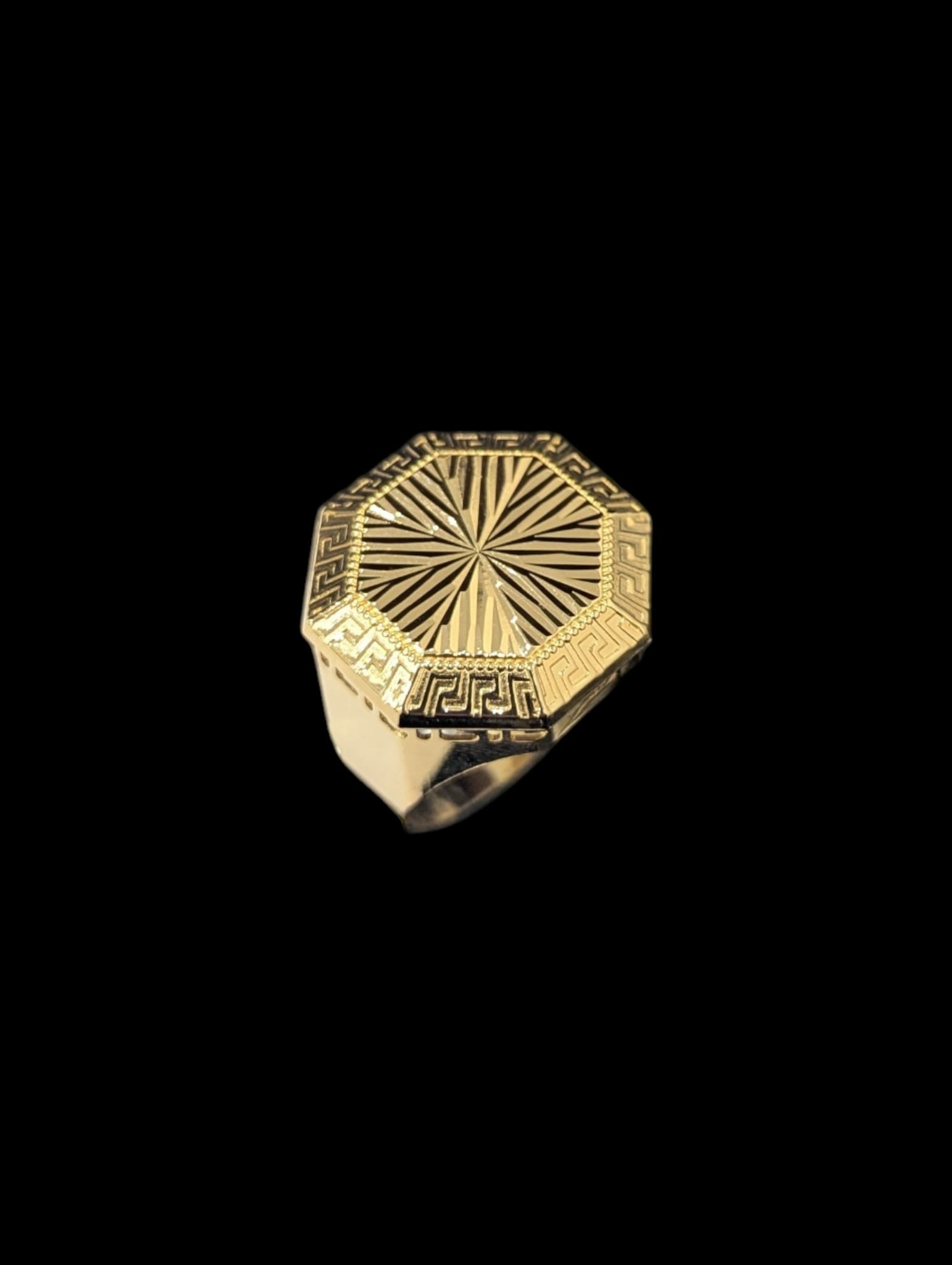 Chevalière octogone avec plateau ciselé « soleil » et détails contour grec en découpe. Chevalière de longueur 22 mm sur 22 mm de largeur.
