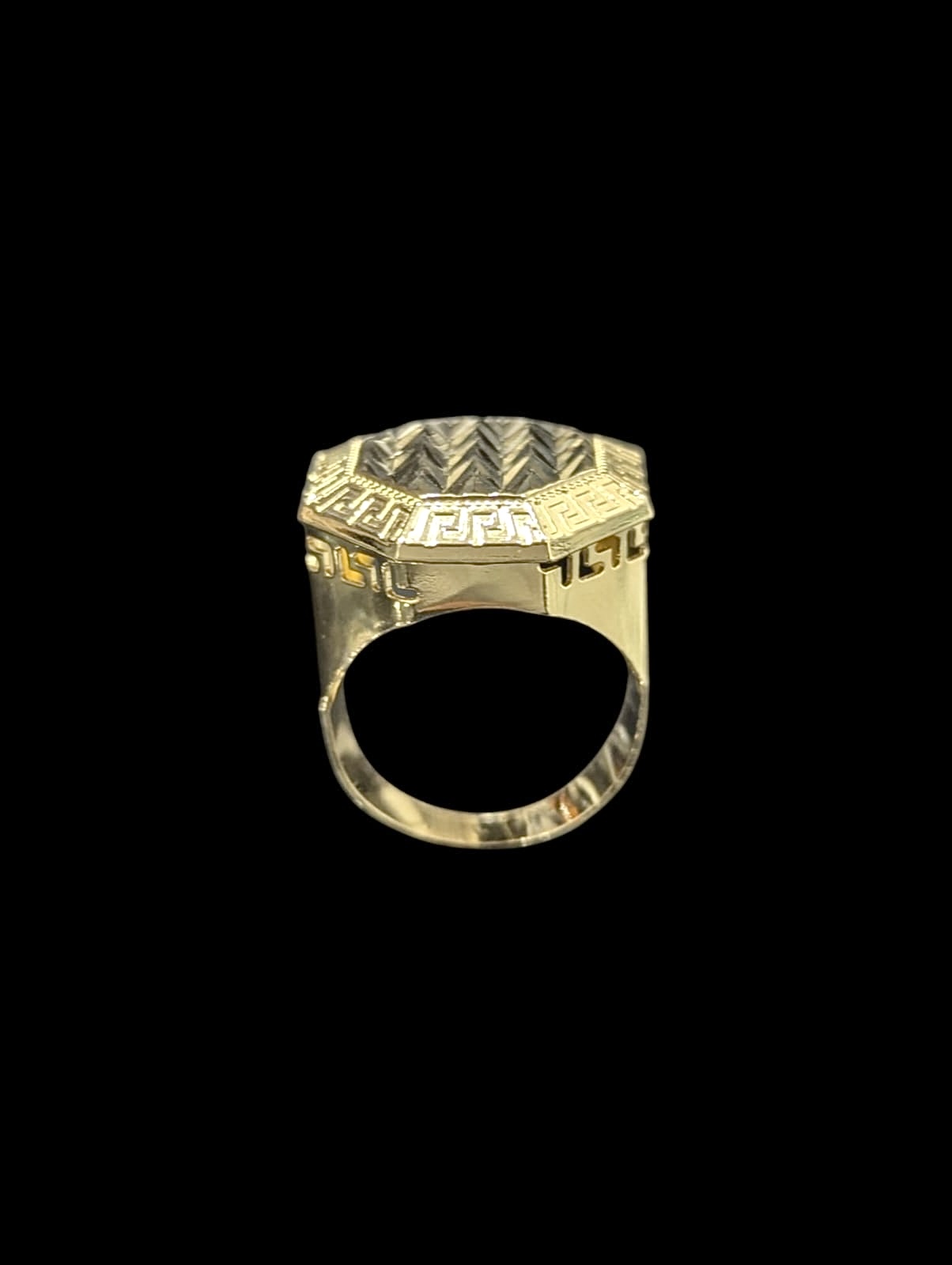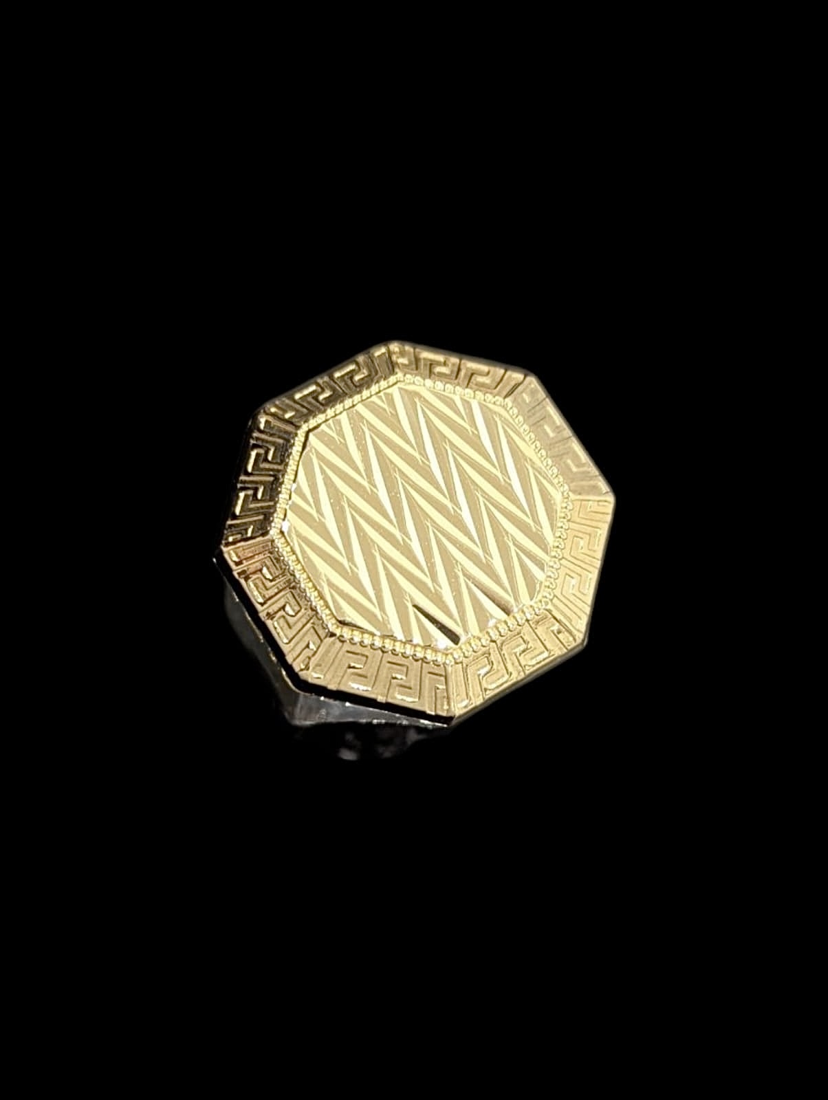 Chevalière en forme d’octogone avec plateau effet facette contour grec avec bordures découpées style grec. Chevalière de diamètre 22 mm.