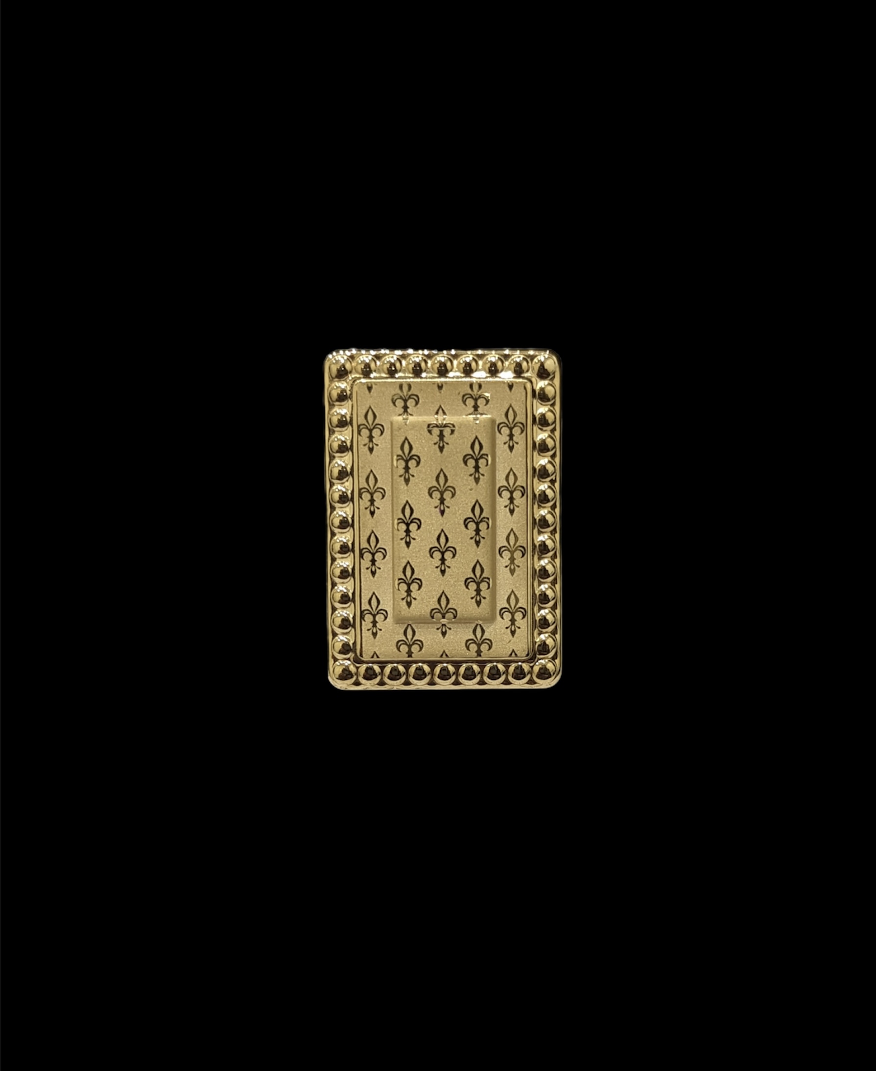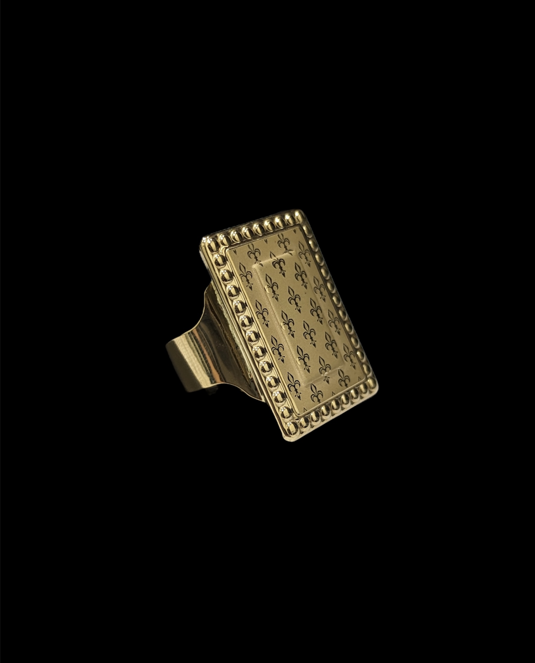 chevalière rectangle « biscuit » avec motif fleur de lys sur le plateau,largeur 24 mm sur 34 mm de longueur