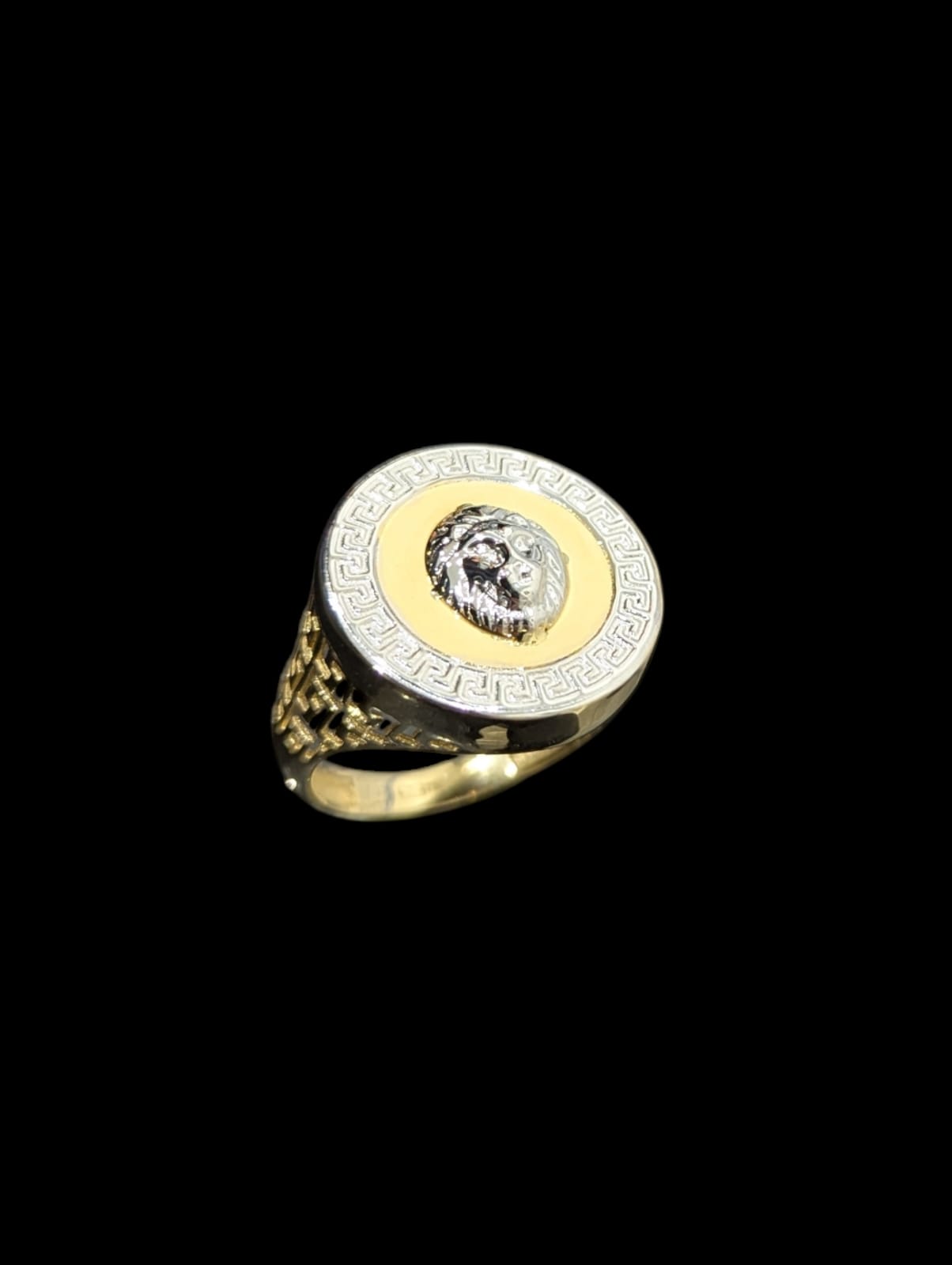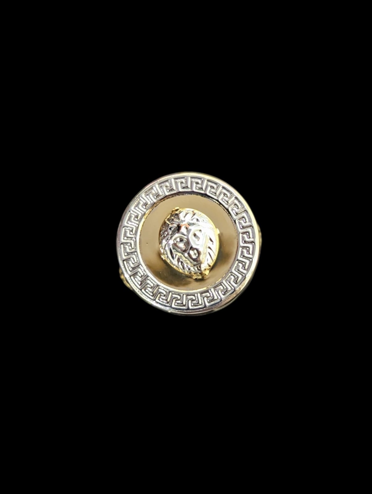 Chevalière de forme ronde contour style grec, Or Blanc et Jaune,diamètre 20 mm