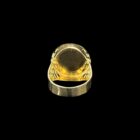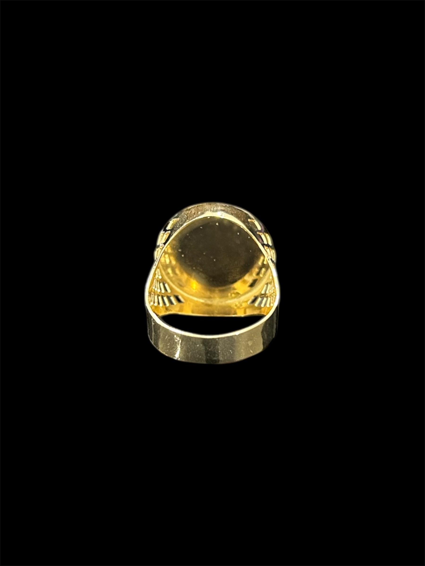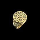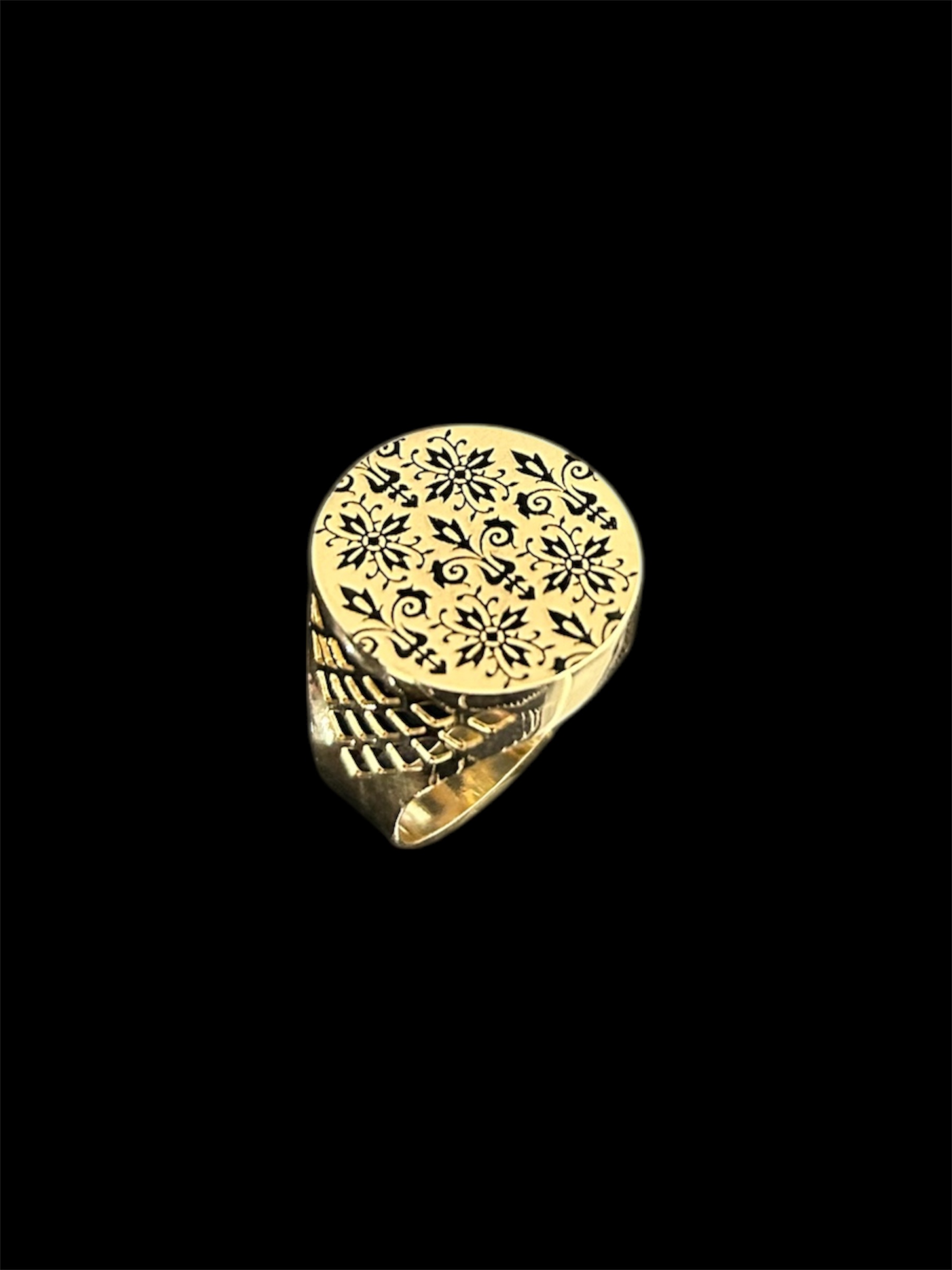 Chevalière de forme ronde avec le plateau gravé de plusieurs fleurs de Lys, de diamètre 23 mm avec découpe style quadrillage sur tout le contour.