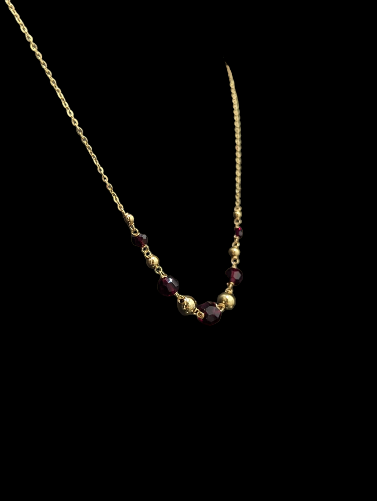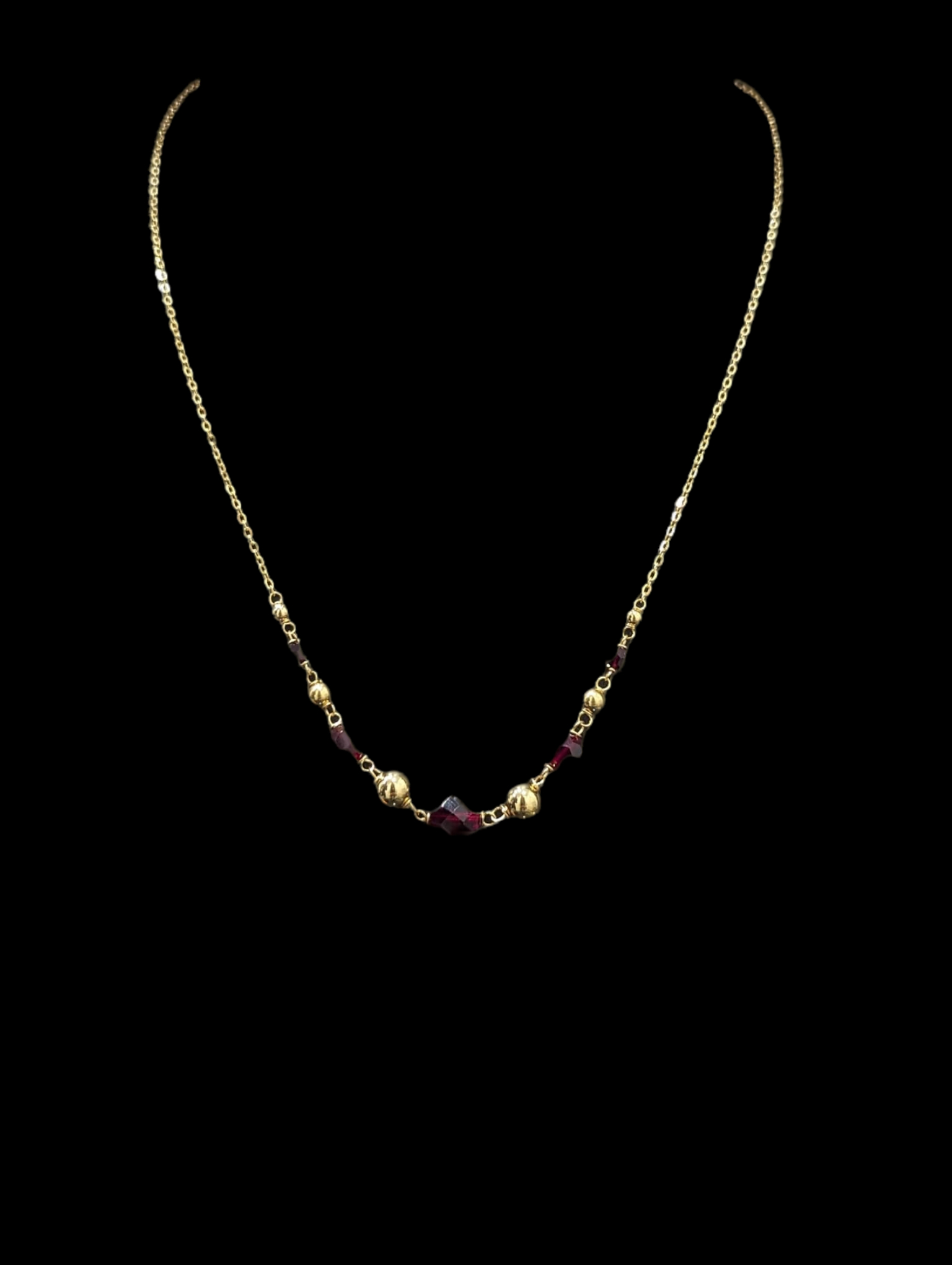 Collier maille forçat de largeur 1 mm sur 45 cm de longueur accompagnée de pierres grenat (central de diamètre 8 mm) et de boules lisse. Fermoir anneau ressort.