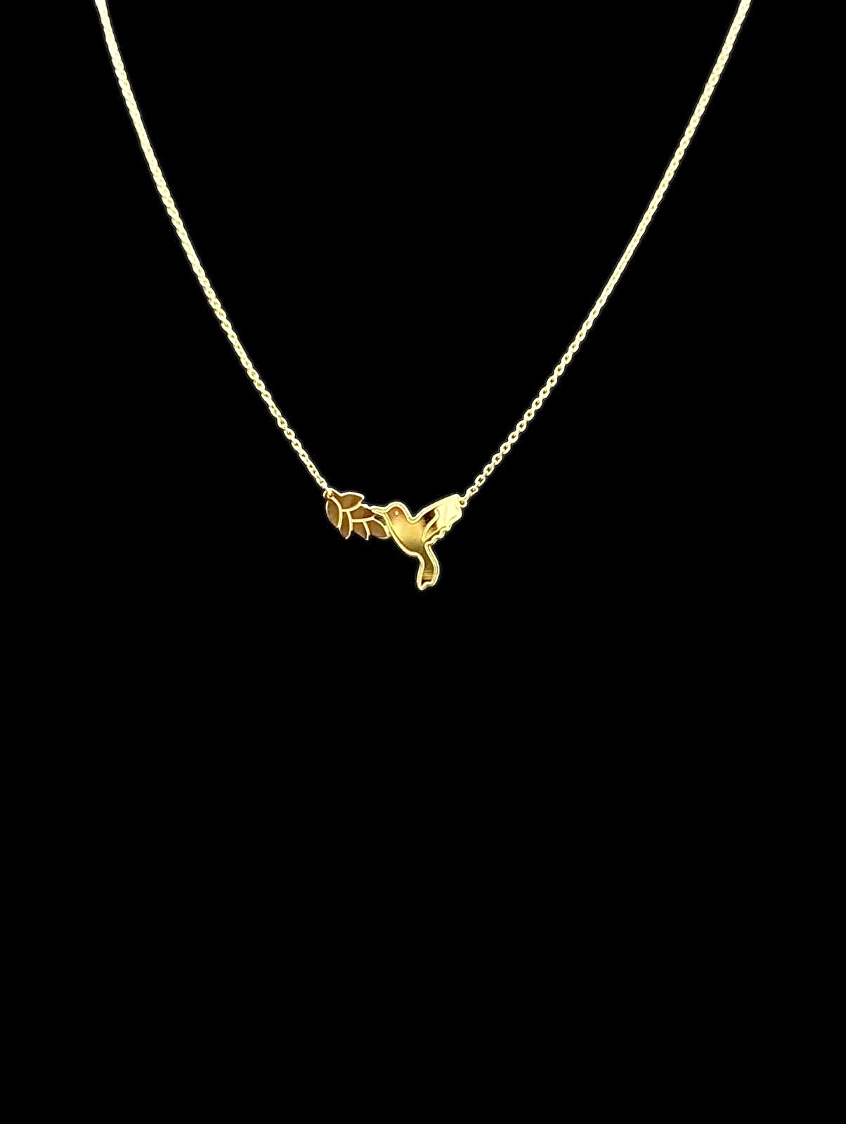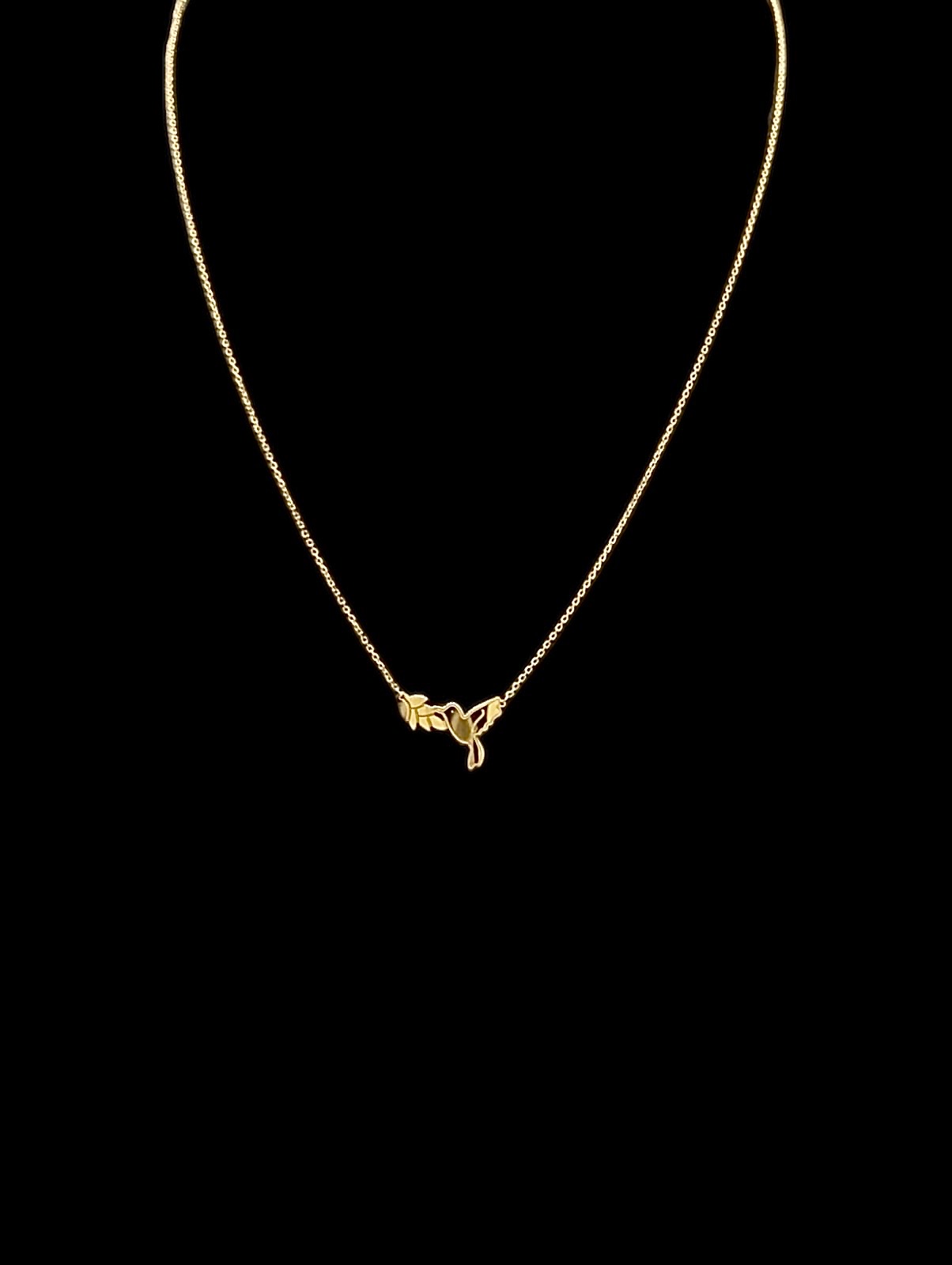 Collier maille forçat accompagné d’un colibri et d’une fleur de balisier, de finition lisse, de longueur 11 mm sur 17 mm de largeur. Chaine de longueur 50 cm dont 3,5 cm ajustable, et de largeur 1 mm, fermoir anneau ressort.