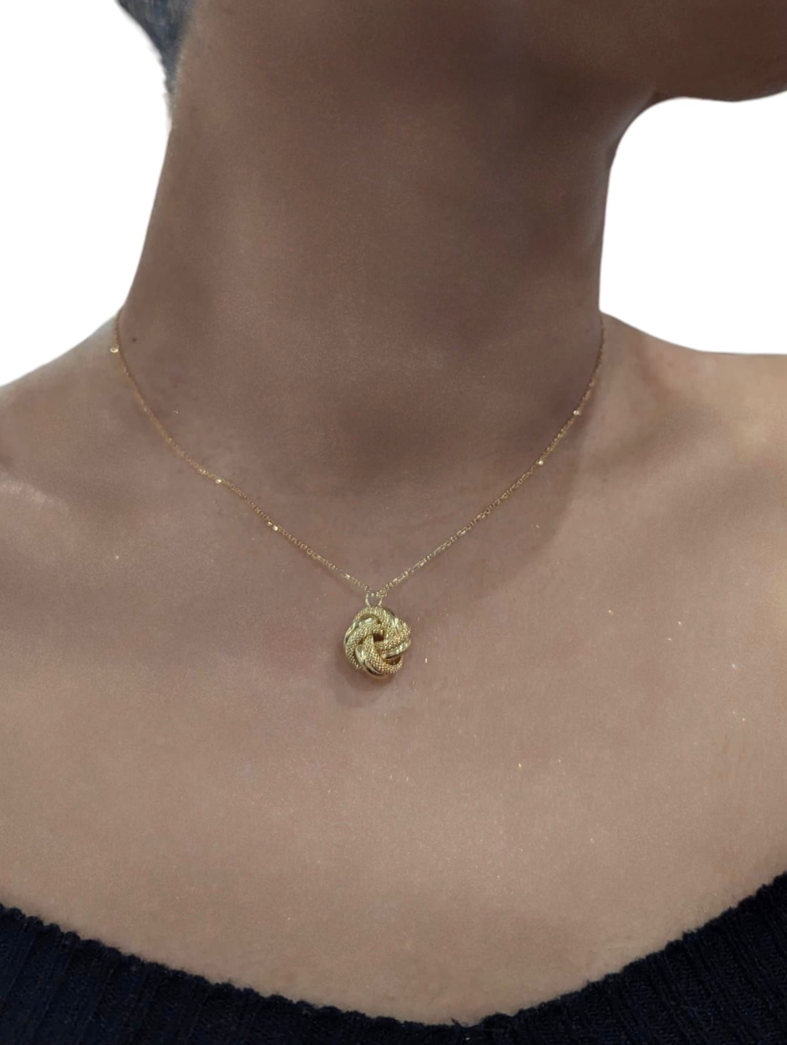 Collier maille forçat de largeur 1 mm sur 45 cm de longueur dont 3 cm ajustables, accompagné de son pendentif noeud lisse et sablé de diamètre 12 mm. Fermoir anneau ressort.