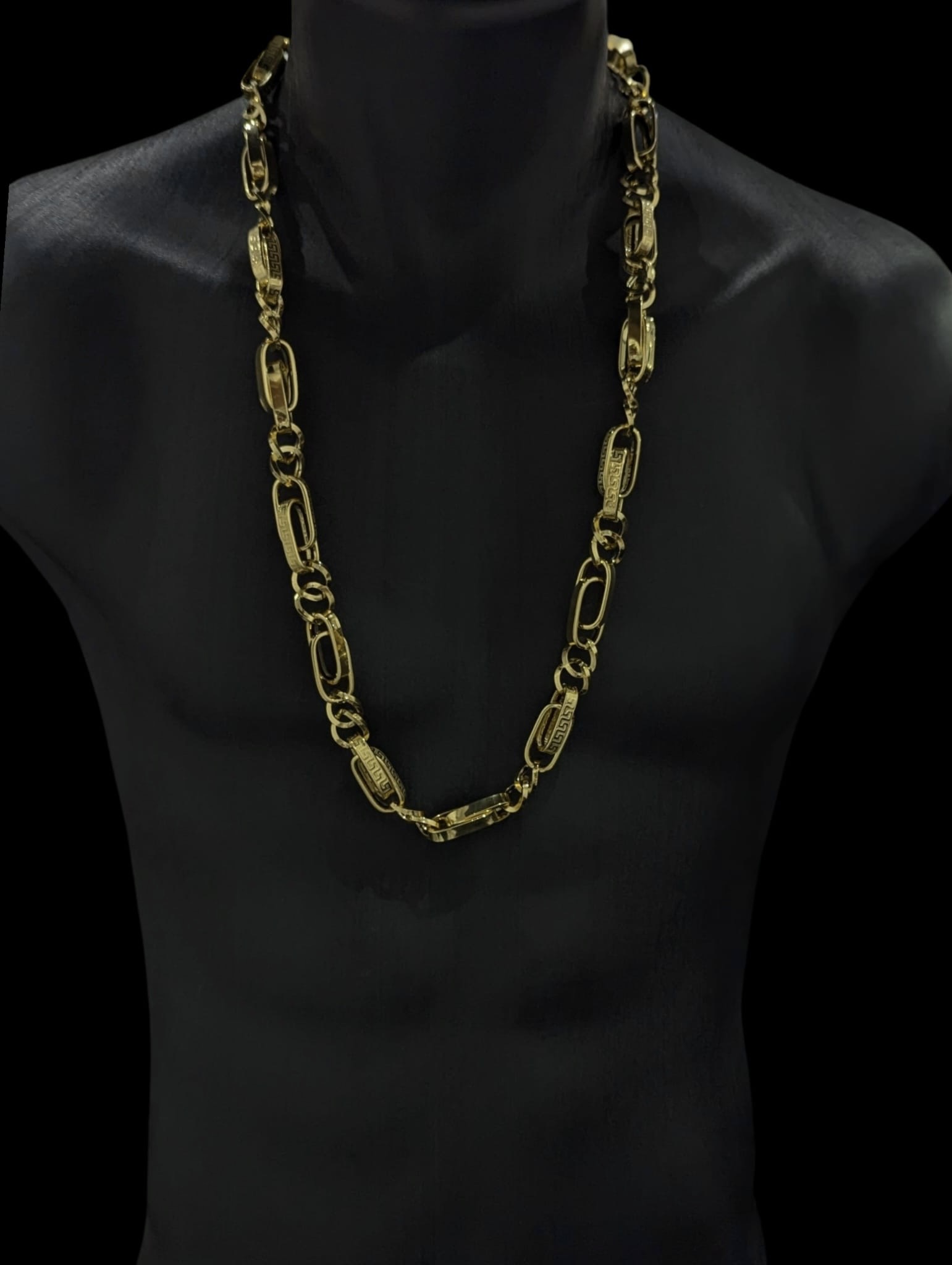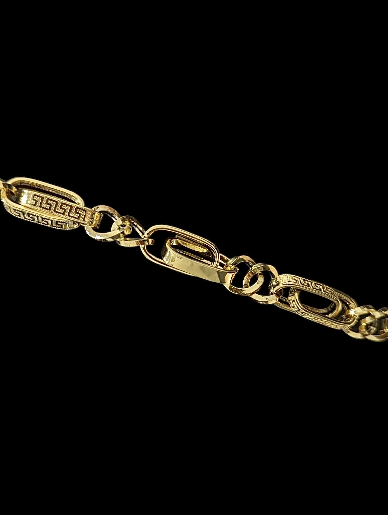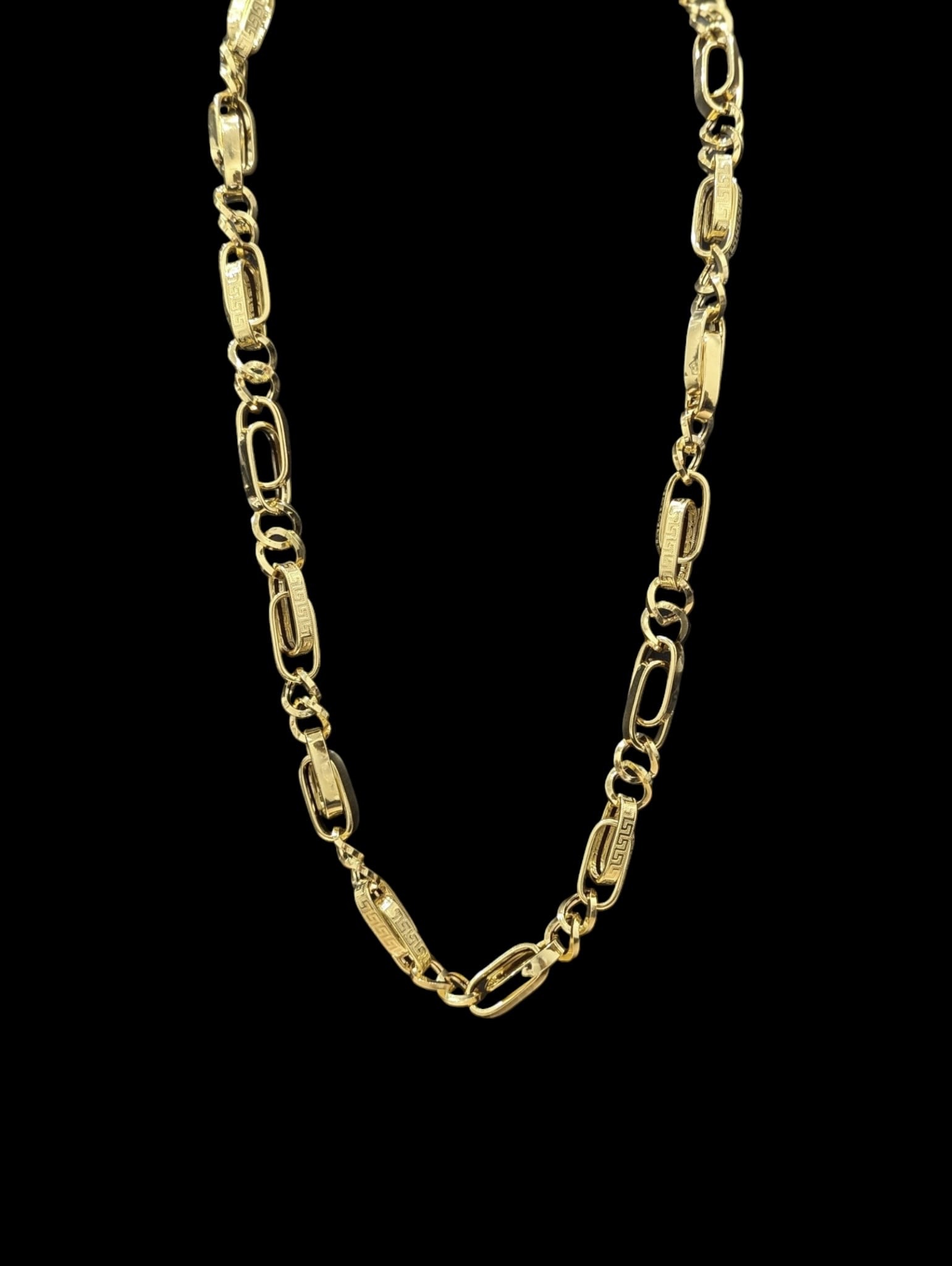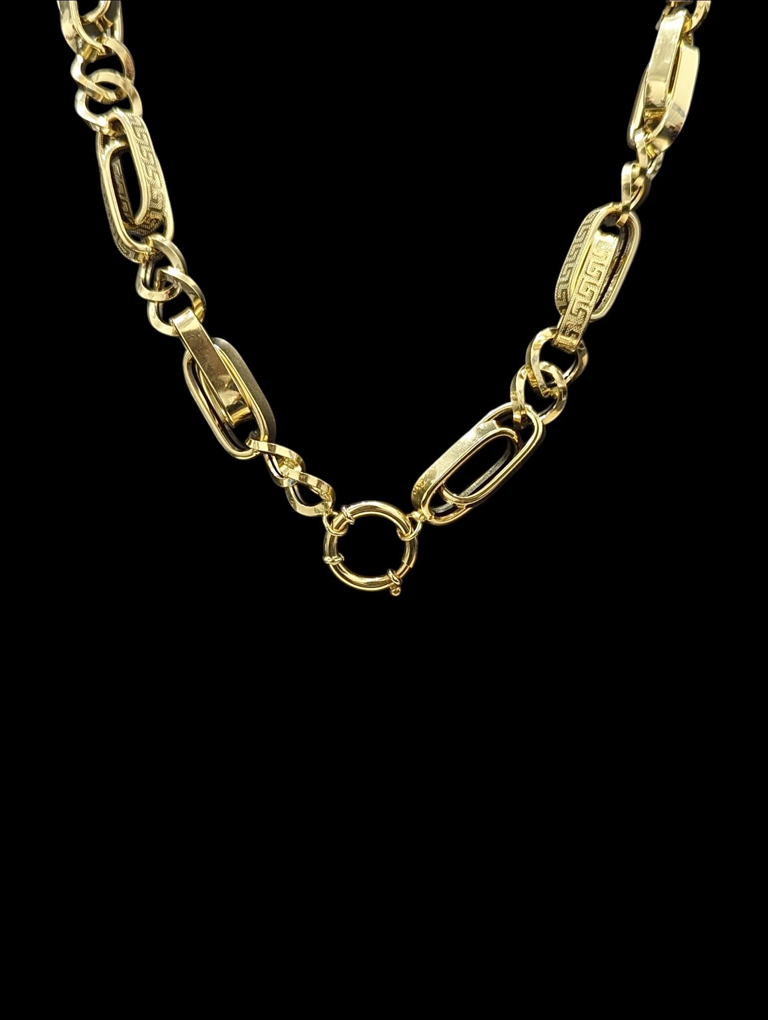 Collier maille disco alternée de finition lisse et motif grec. Collier de largeur 13 mm sur 80 cm de longueur, fermoir anneau bouée de diamètre 20 mm.