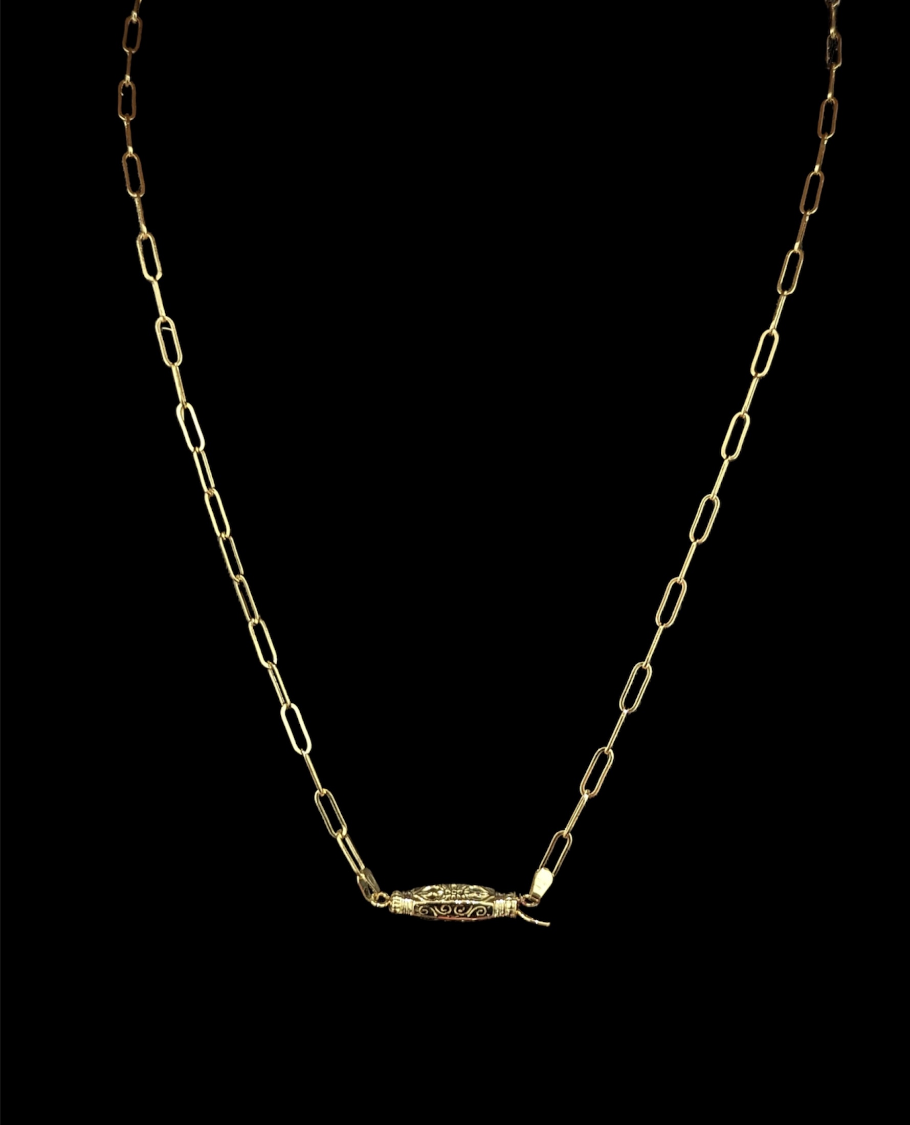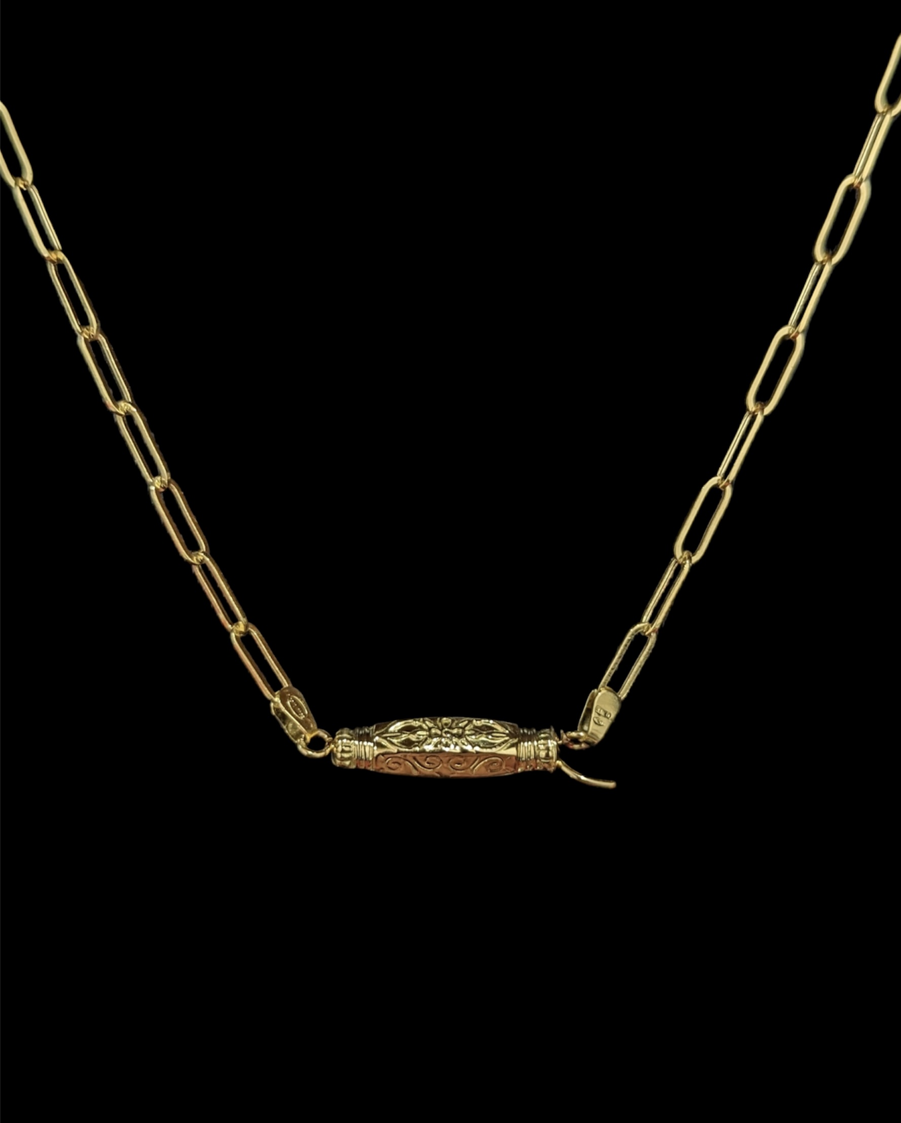 collier maille forçat allongée ,largeur de maille 3 mm + barillet ciselée 7 mm de largeur sur 29 mm de longueur,longueur de l’ensemble 57 cm