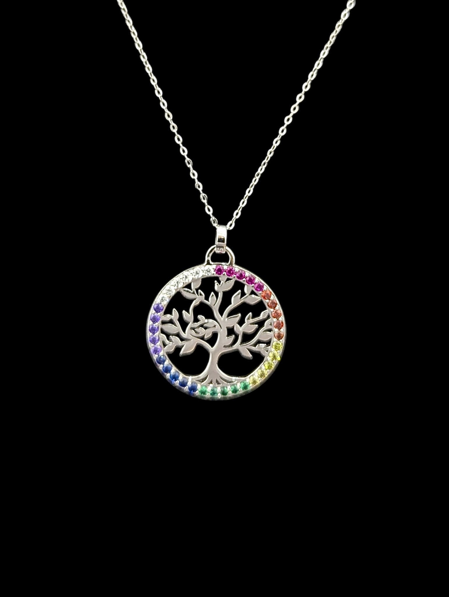 Collier maille forçat fantaisie de longueur 50 cm dont 3.5 cm ajustables et 1 mm de largeur. Collier accompagné de son pendentif arbre de vie de diamètre 25 mm empierré pierres colorée fantaisie. Fermoir mousqueton. Bijou marqué Lotus argent 925 millièmes rhodiés.