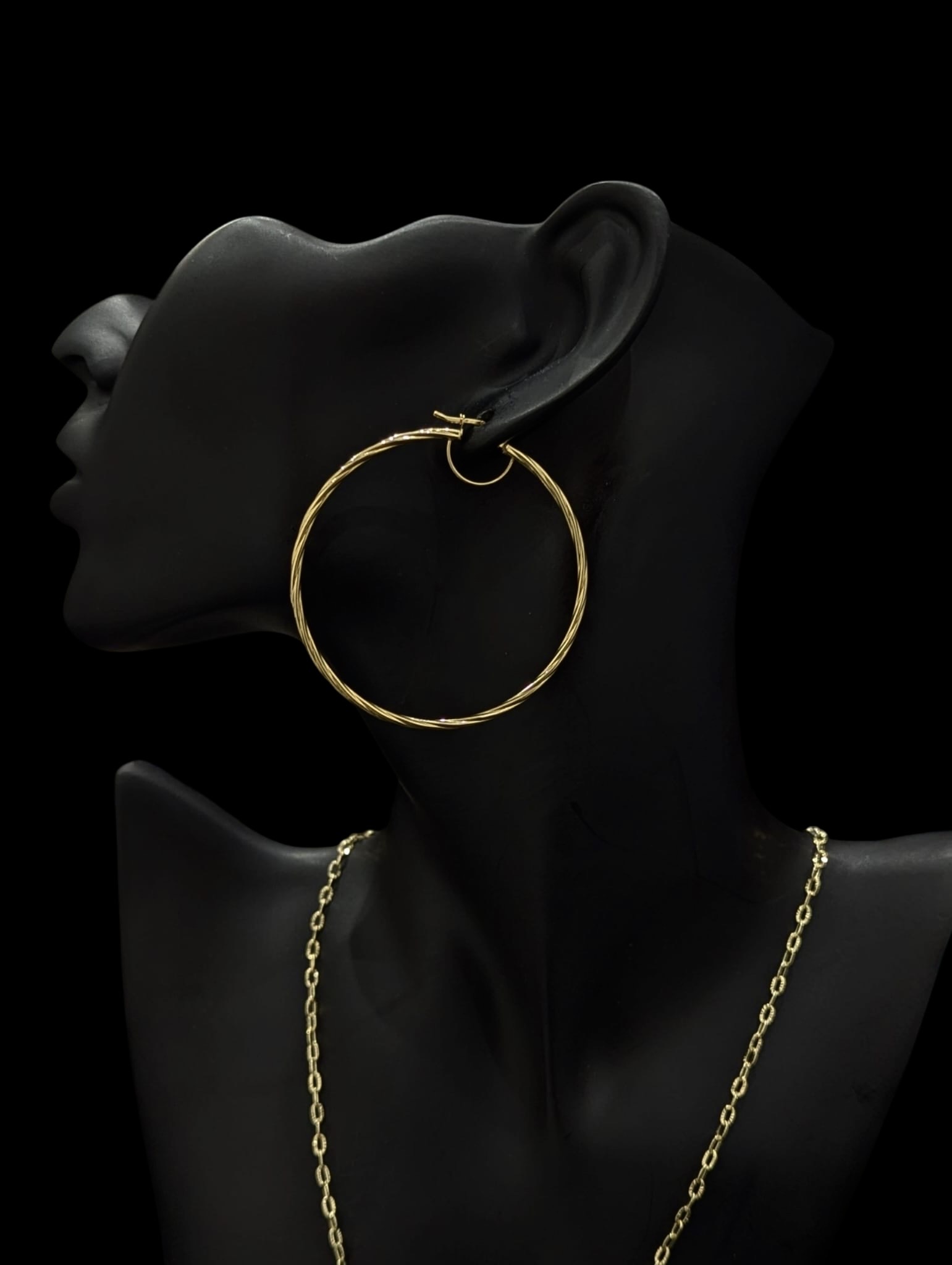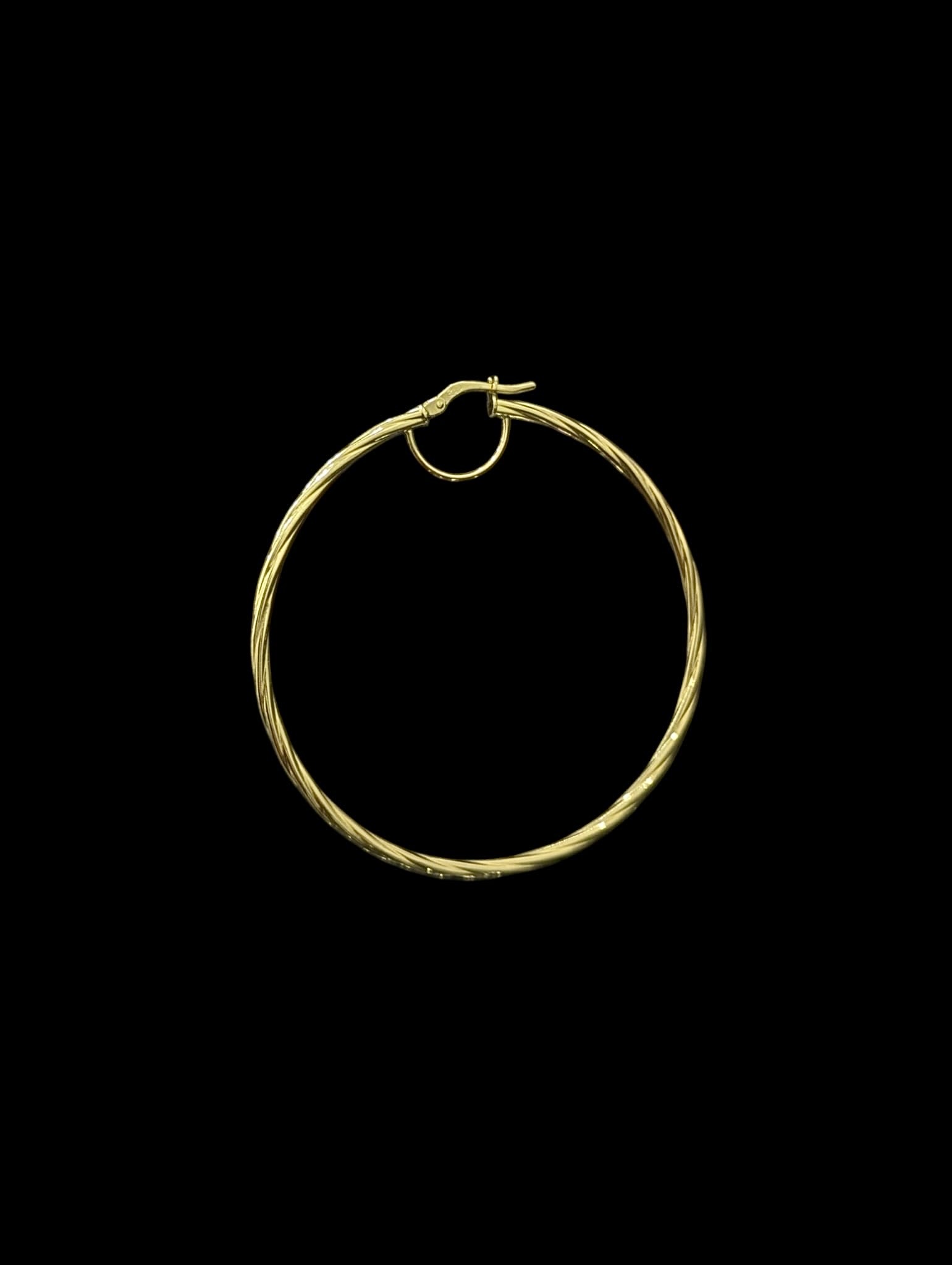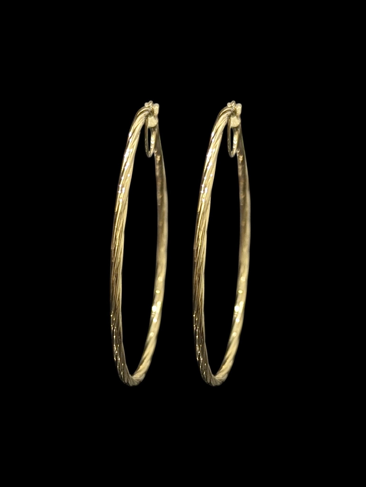 Créoles torsadées finition lisse de diamètre 54 mm sur 2 mm d’épaisseur. Fermoir charnière.