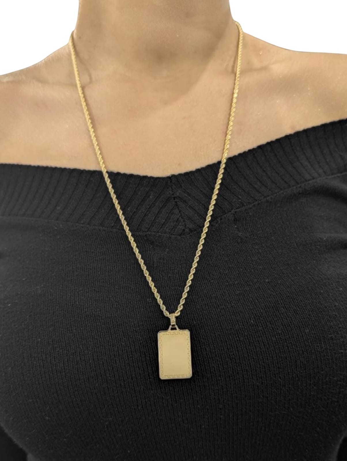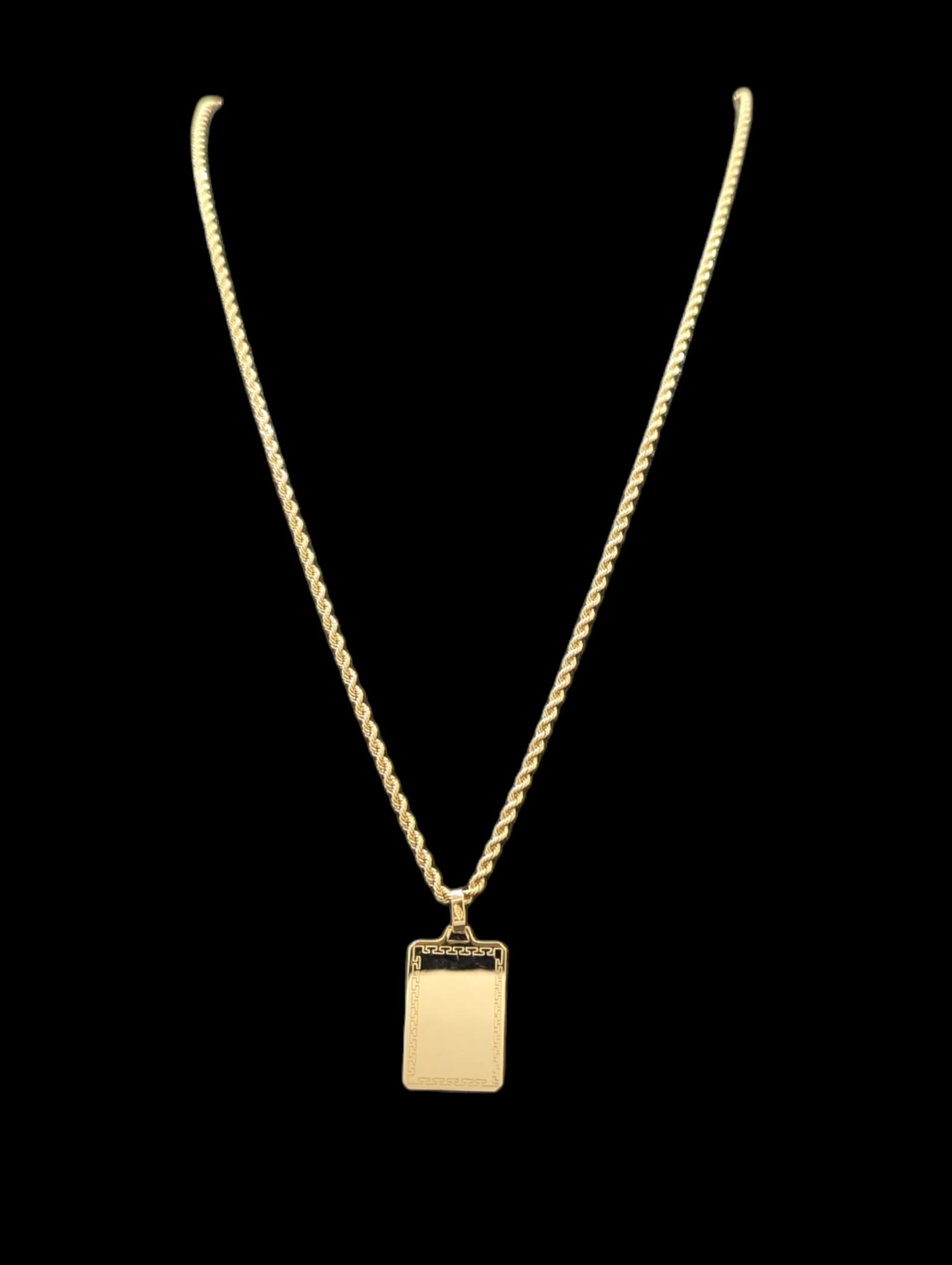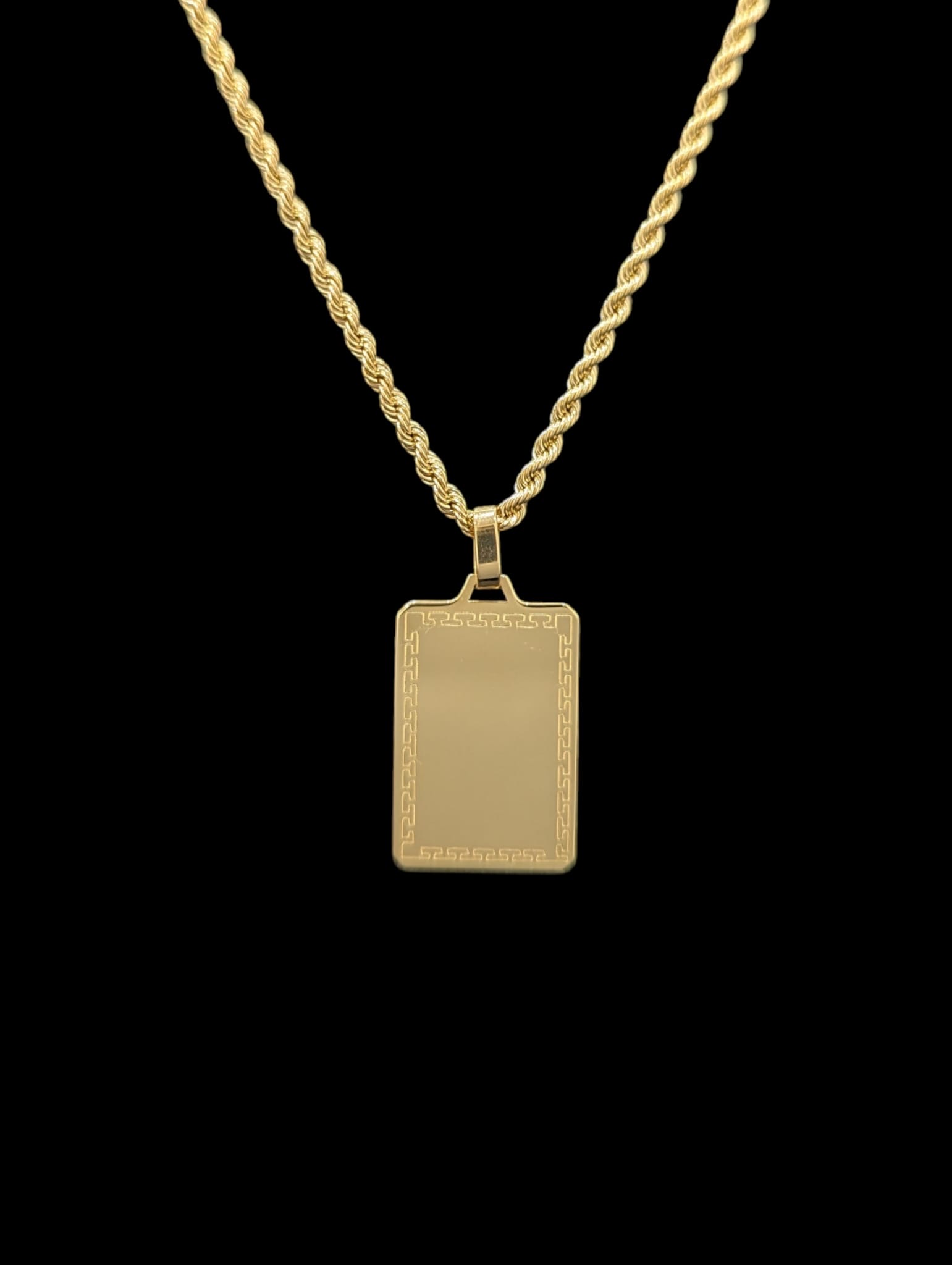 Chaine maille corde 2 mm largeur sur 70 cm de longueur,fermoir anneau ressort + pendentif plaque rectangulaire contour grec et centre lisse (gravure offerte ,nous contacter) 17 mm sur 25 mm de hauteur