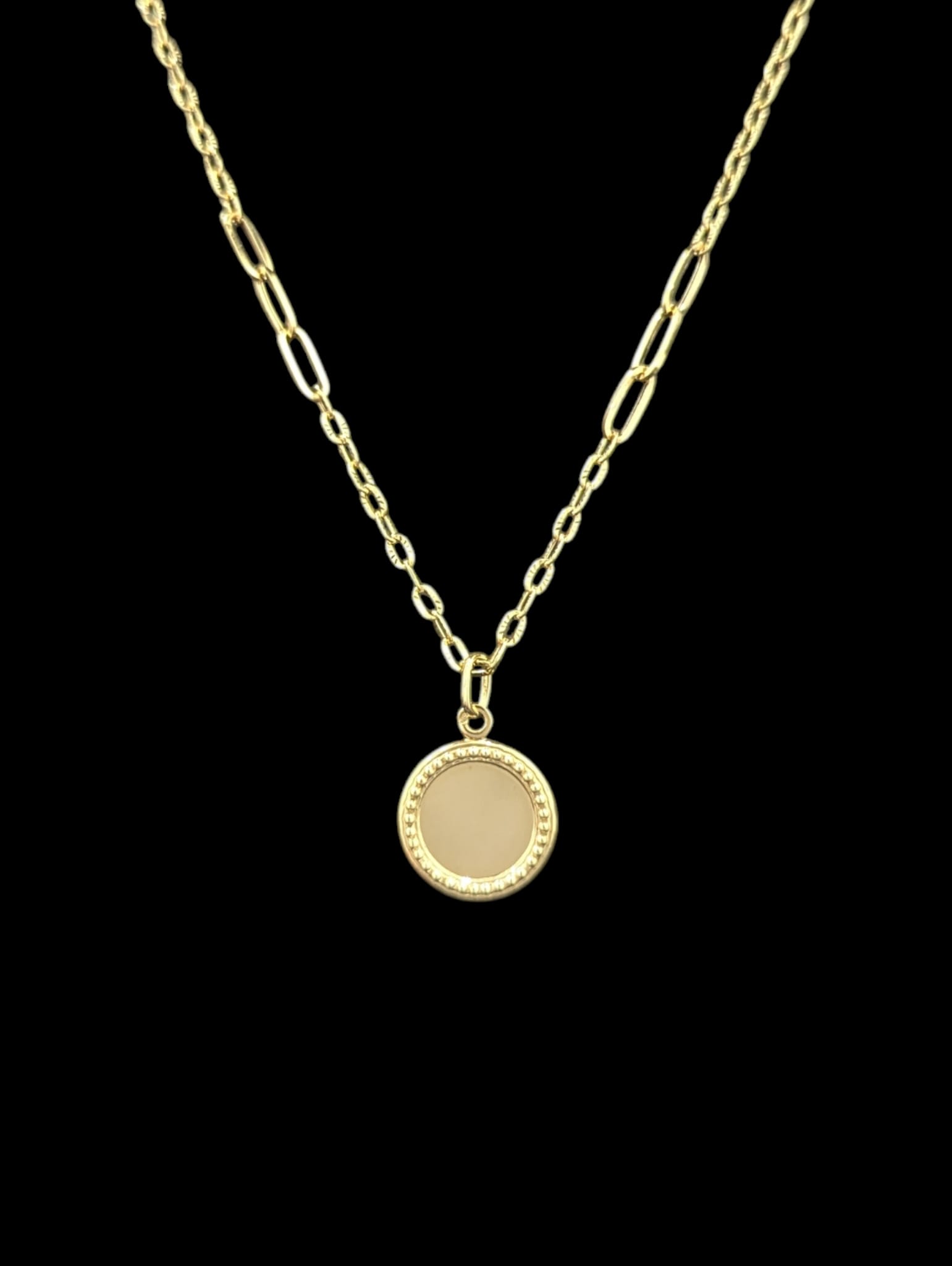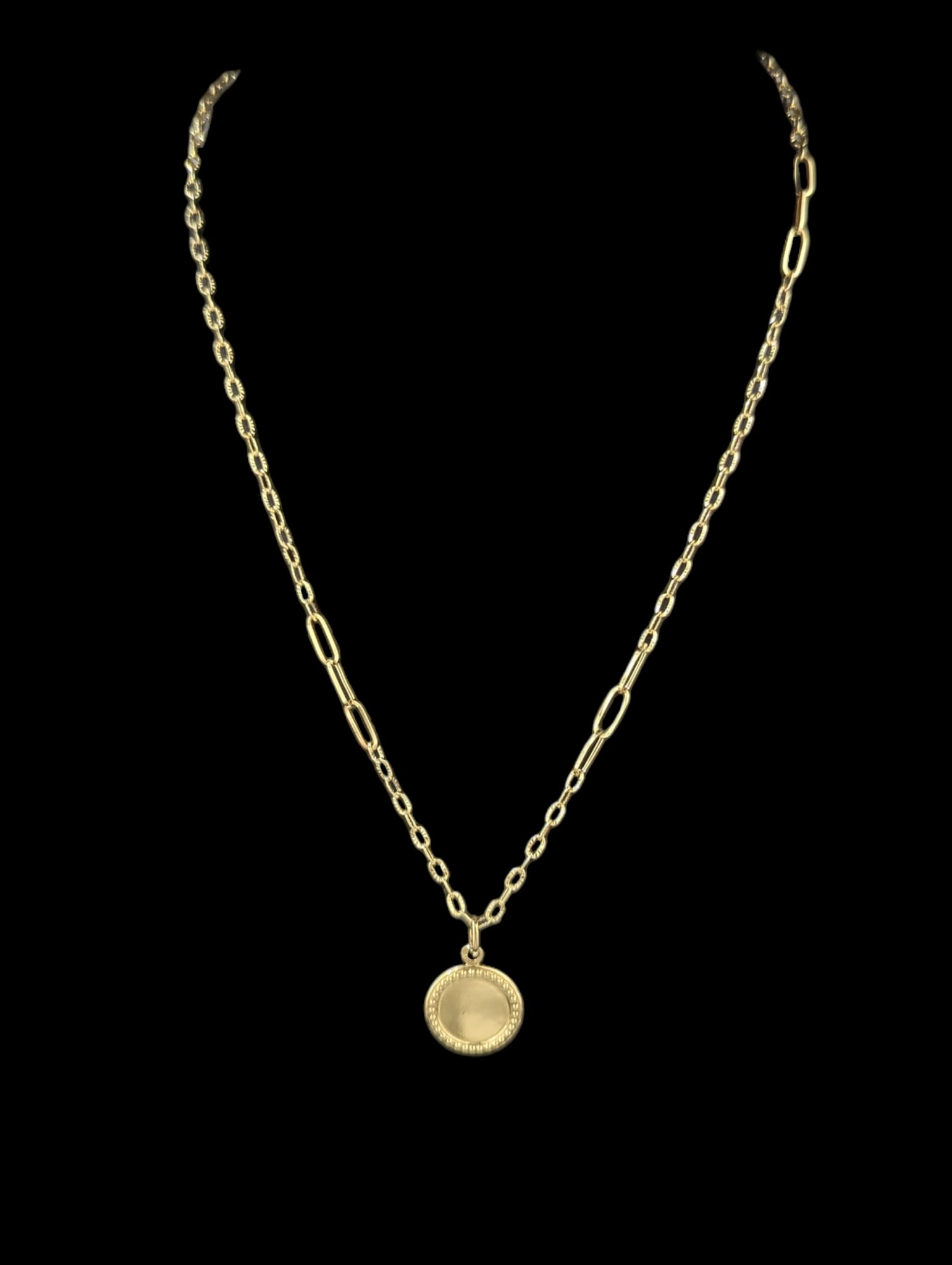 Ensemble chaine maille forçat striée et alternée lisse,2 mm de largeur sur 45 cm de longueur,fermoir anneau ressort + Pendentif rond lisse et contour striée à personnaliser,diamétre 15 mm (gravure initiale,carte des dom tom ,offerte à préciser dans Note)