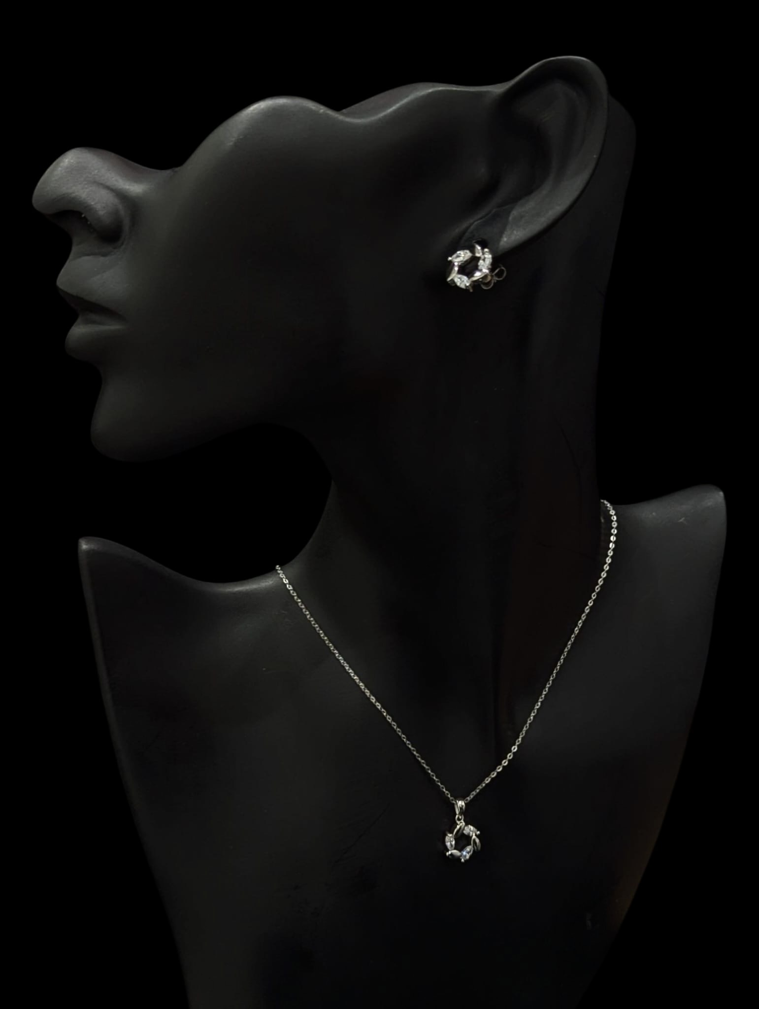 Ensemble collier maille forçat fantaisie de longueur 50 cm dont 3.5 cm ajustables et 1 mm de largeur. Collier accompagné de son pendentif de diamètre 10 mm empierré pierres en oxydes de zirconium. Boucles d’oreilles de diamètre 10 mm. Fermoir mousqueton. Bijou marqué Lotus argent 925 millièmes rhodiés.