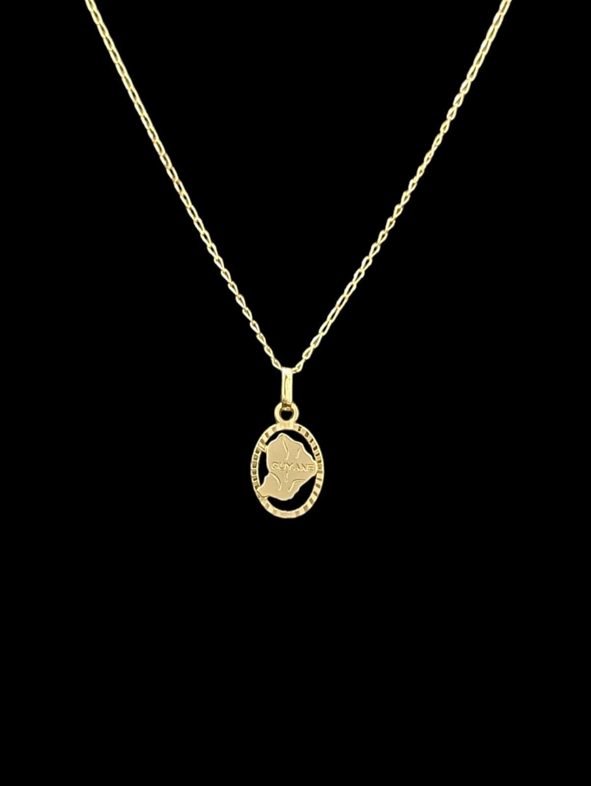Ensemble maille gourmette de longueur 45 cm sur 1 mm de largeur, accompagné de son pendentif Guyane avec un contour, finition lisse, de longueur 10 mm sur 9 mm de largeur, bélière pour chaîne max 2/3 mm.