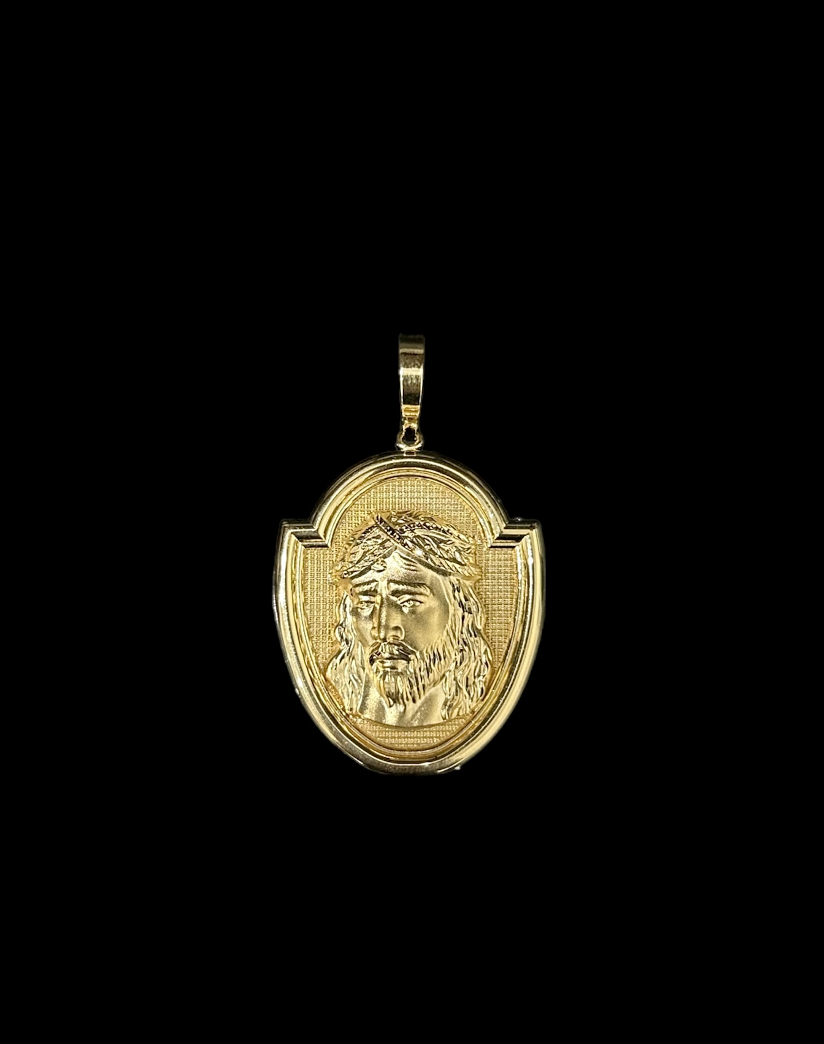 Ensemble en or 18 carats composé d’une chaîne maille corde de 70 cm 4 mm avec fermoir anneau ressort, accompagnée d’un pendentif blason tête de Christ en relief 3D de 43 mm sur 33 mm, avec bélière adaptée jusqu’à 7 mm. Un bijou au caractère fort, alliant spiritualité et élégance.