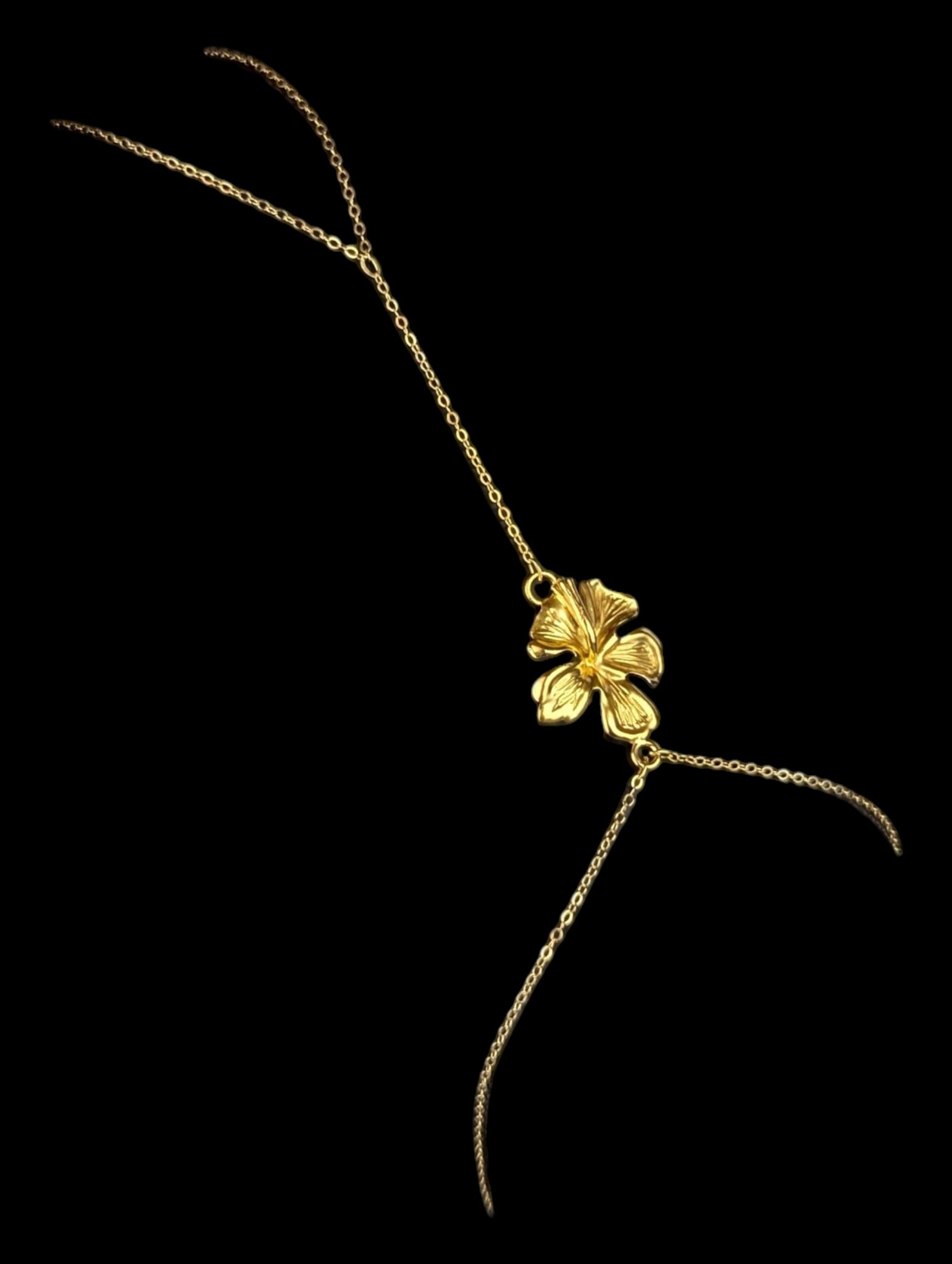 Parure de main chaine maille forçat avec motif hibiscus de 15mm, tour de poignet max 19 cm, fermoir anneau ressort.