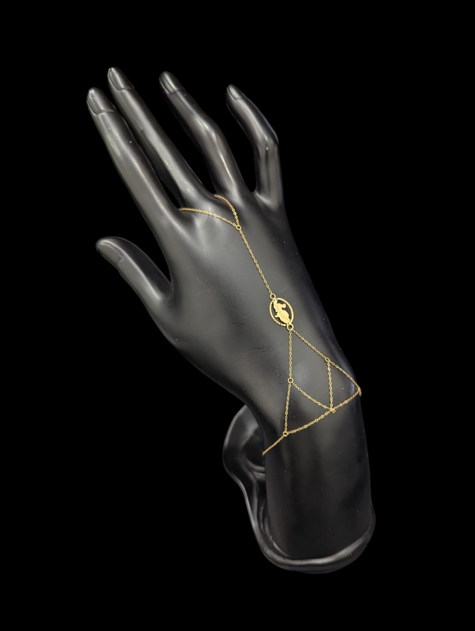 Parure de main en or 18 carats avec chaîne maille forçat, ornée d’un motif central carte de la Martinique entouré de 12 mm. Adaptée à un tour de poignet jusqu’à 19 cm, avec fermoir anneau ressort. Un bijou fin et symbolique qui met à l’honneur les racines antillaises avec élégance.