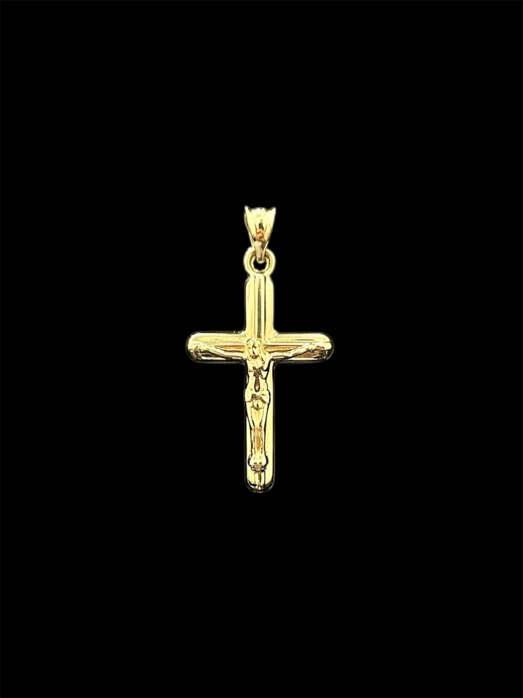 Pendentif en forme de croix à bouts arrondis avec le Christ , longueur 27 mm sur 18 mm de largeur, bélière pour chaîne max 4 mm
