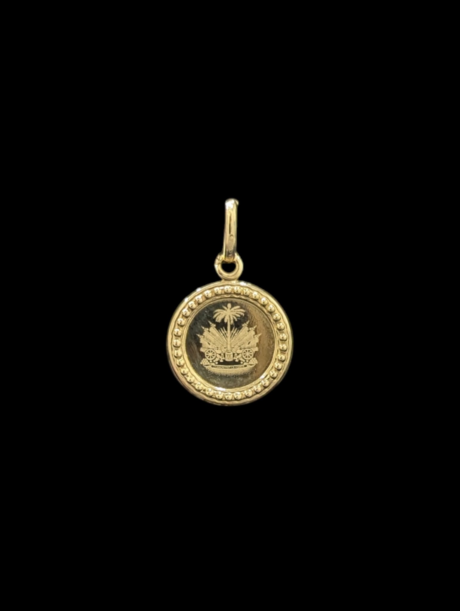 Pendentif en forme de rond,contour ciselé,au centre gravure du blason d’Haïti en mat,diamétre 15 mm,bélière pour chaine max. 3mm