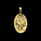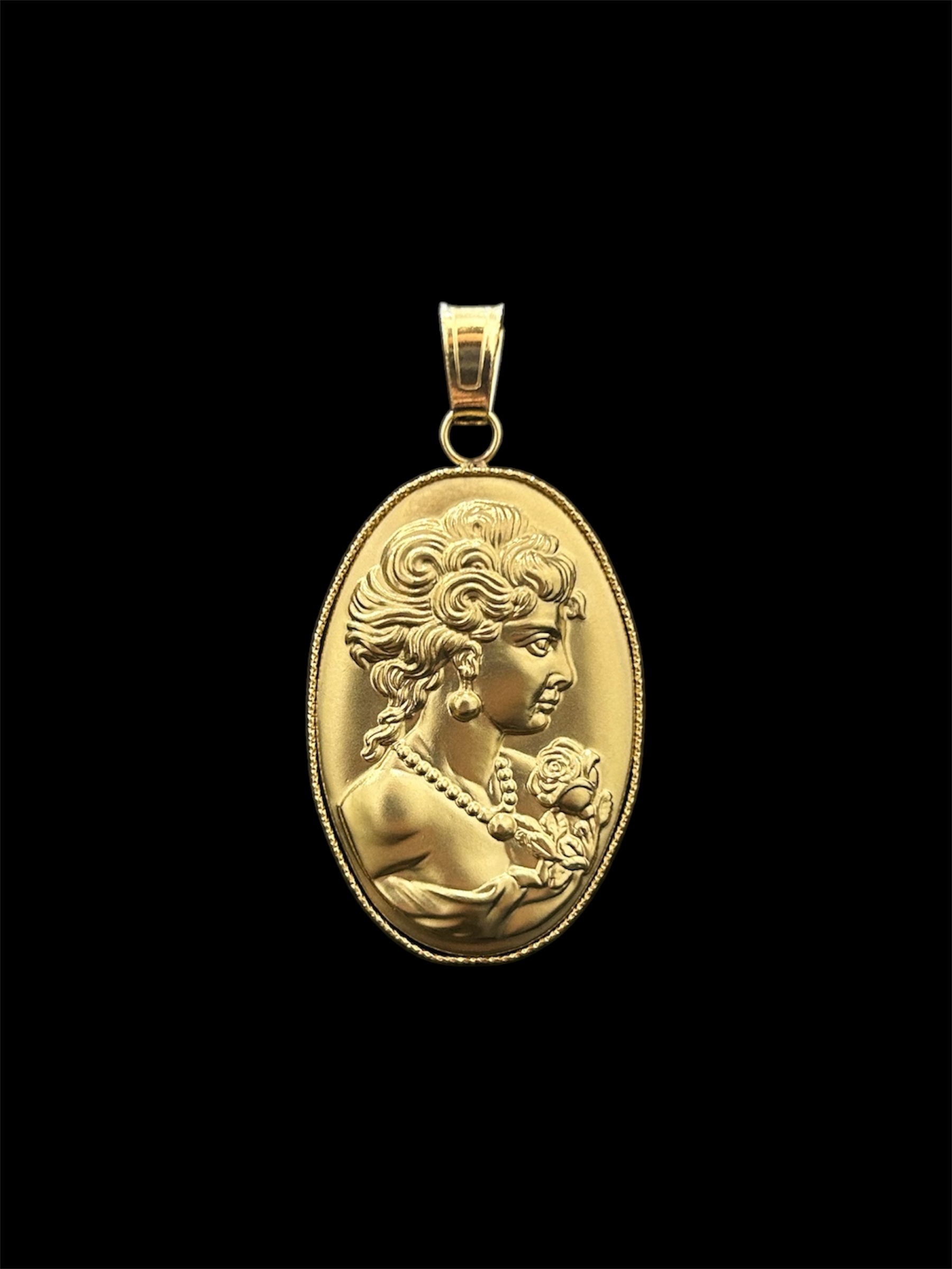 Pendentif ovale style camée or 18 carats, en relief 3D avec finition satinée, mesurant 48 mm de hauteur sur 30 mm de largeur. Doté d’une bélière adaptée jusqu’à 7 mm, ce bijou au style classique et travaillé apporte élégance et caractère.