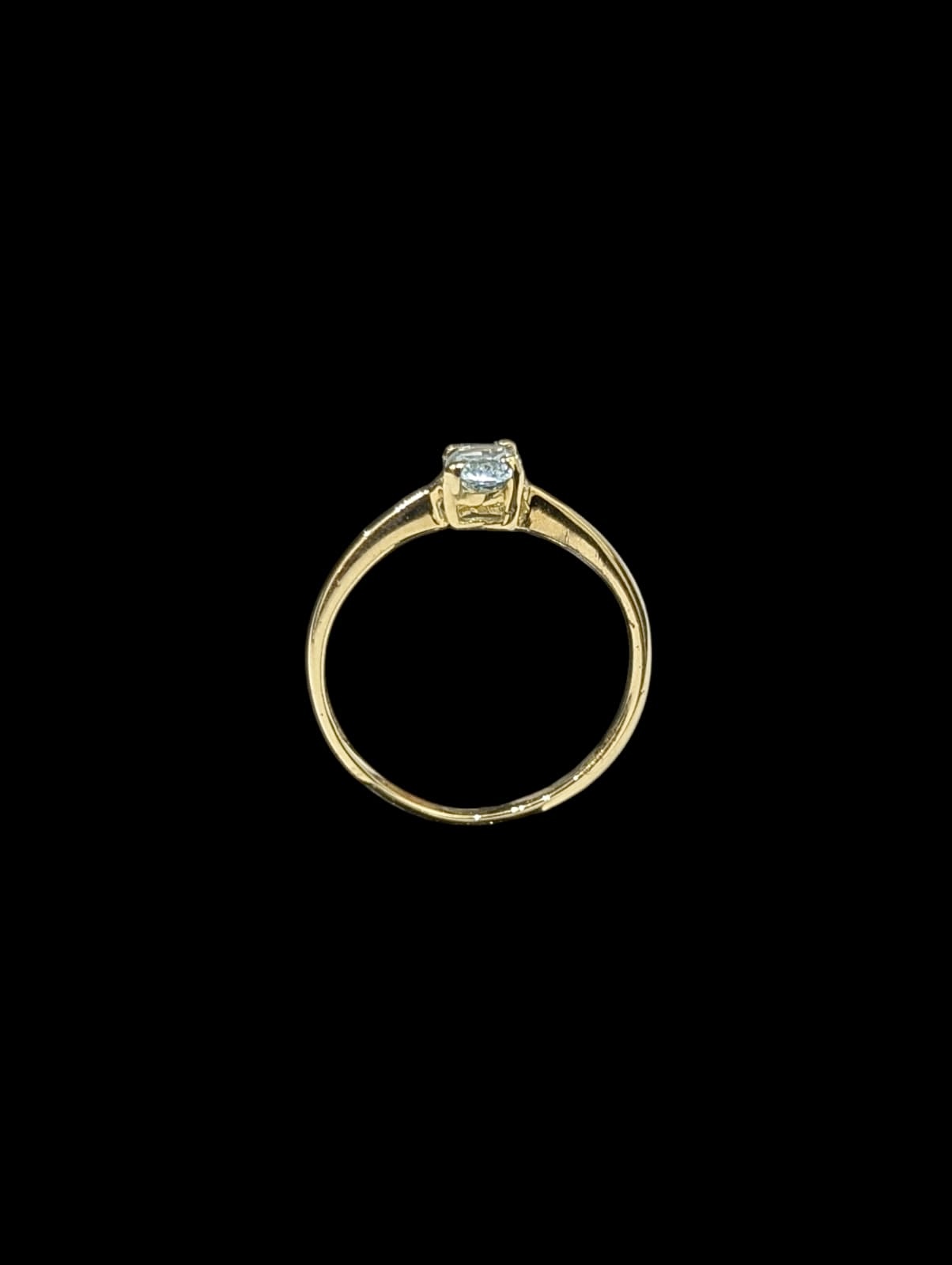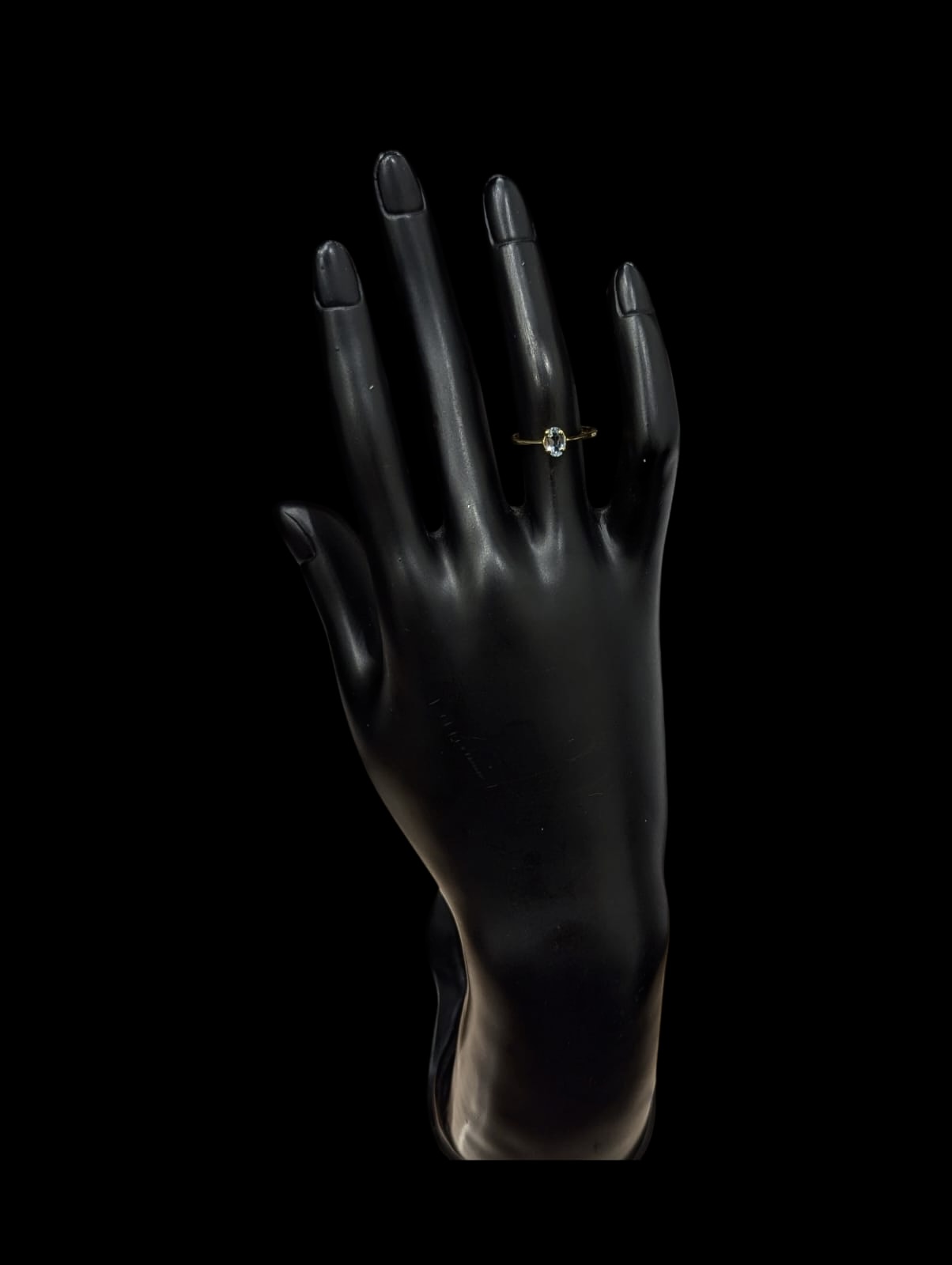 Bague solitaire avec pierre topaze synthétique de couleur bleu clair, de longueur 5 mm sur 4 mm de largeur.